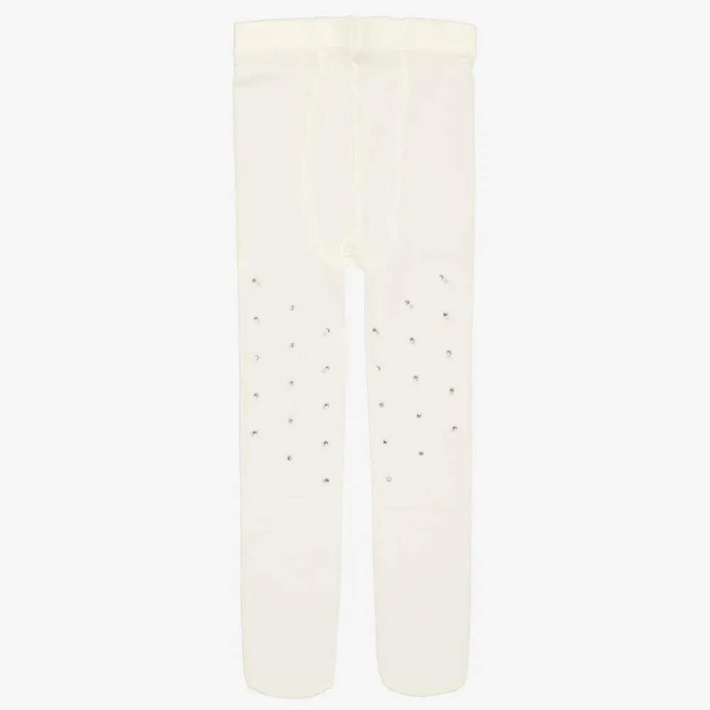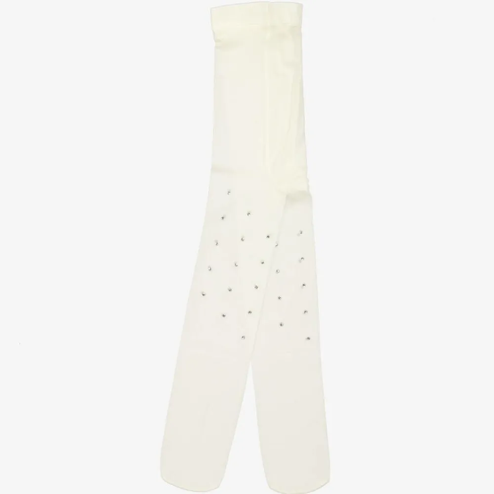 Beautifully patterned with sparkling diamantés, these ivory tights for girls are by Sevva. Soft, sheer and stretchy, they are an ideal complement to her special occasion outfit.