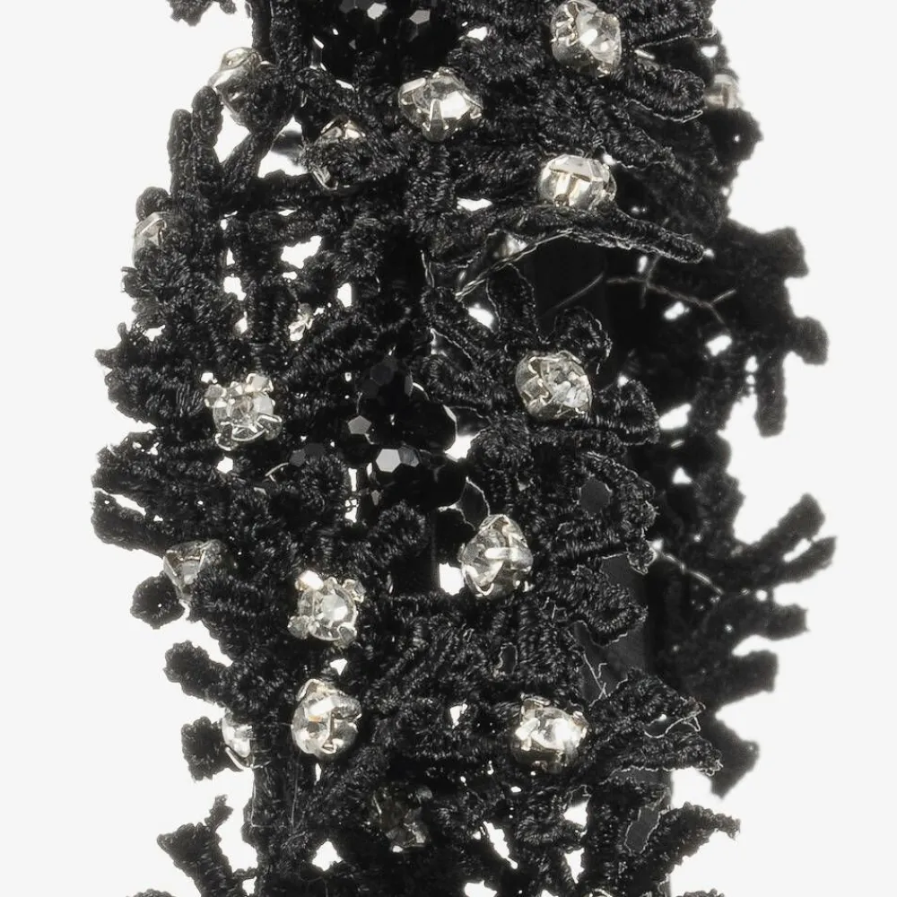 A stunning handmade hairband by Sienna likes to party. The band is covered with black satin and it has beautiful black lace flowers with sparkly diamanté.