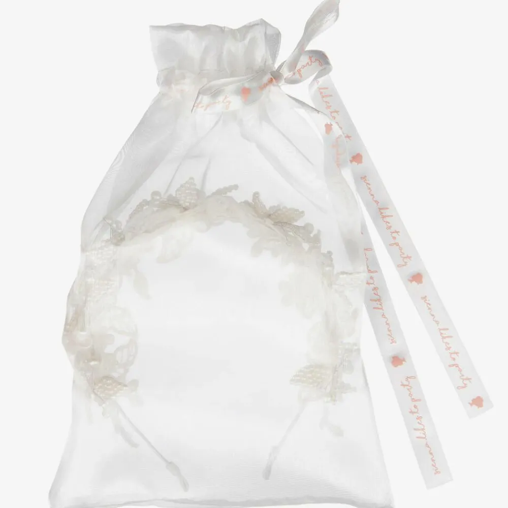 A stunning handmade hairband by Sienna likes to party. The band is covered with white satin and has beautiful ivory lace and beaded flowers.