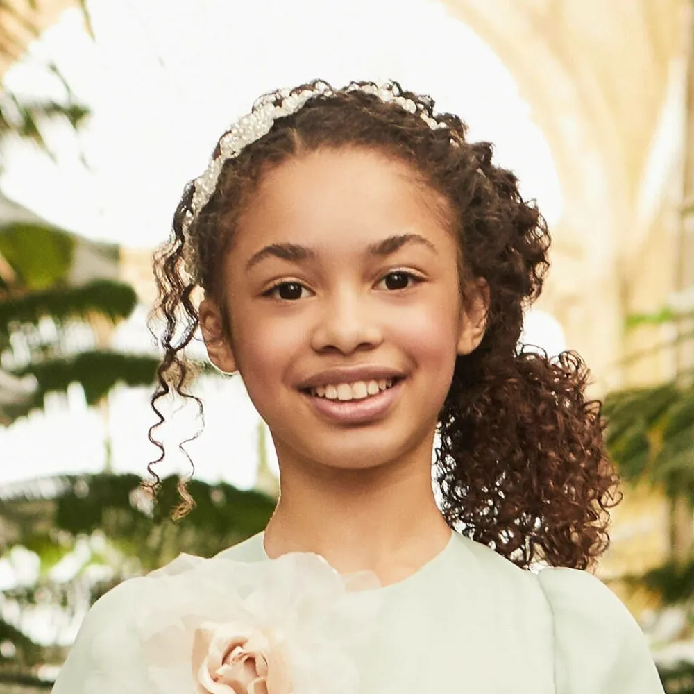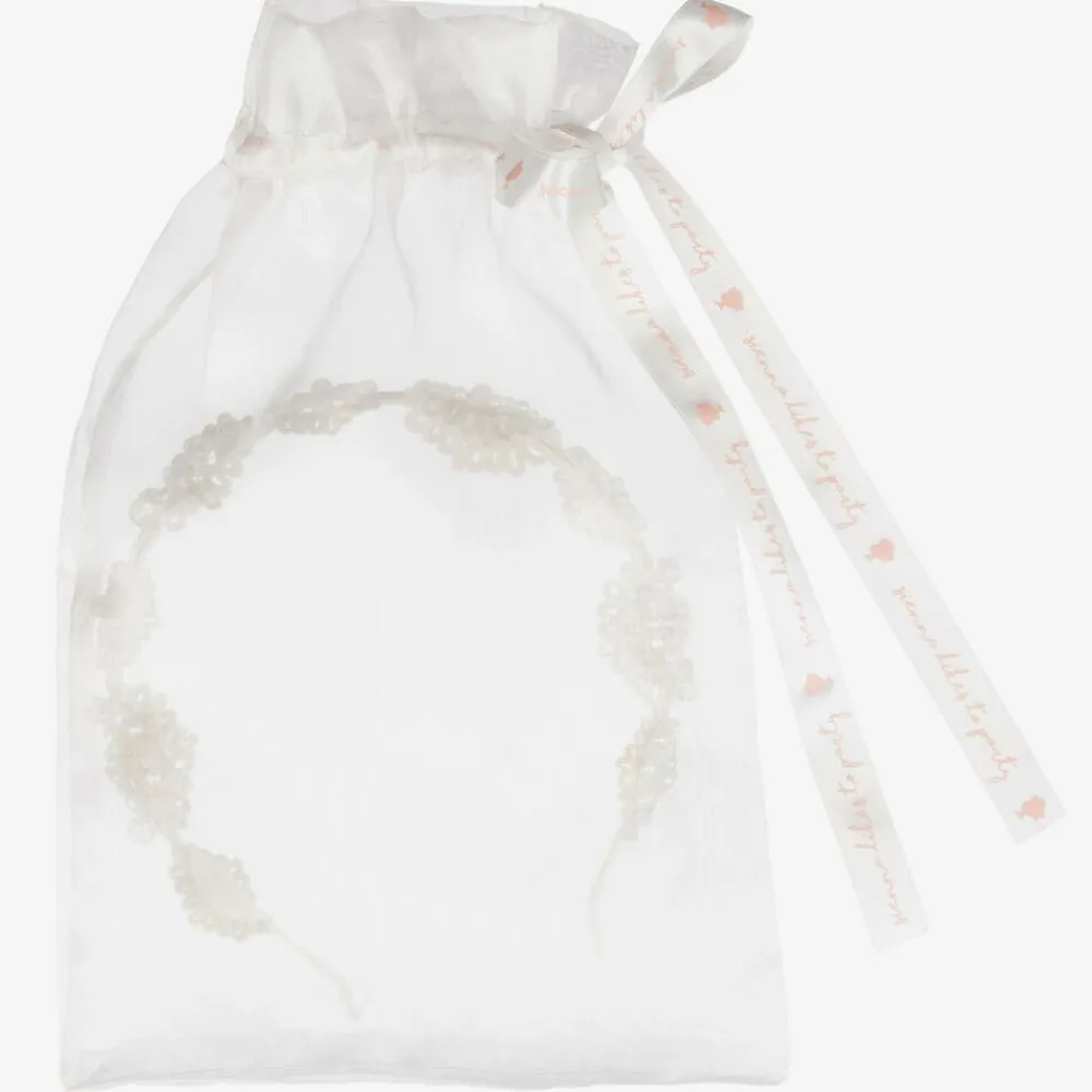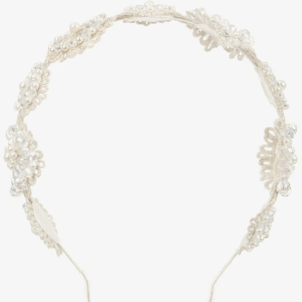Girls handmade ivory satin covered hairband by Sienna likes to party. It has pretty silver lace flowers covered with clear and pearl beads.