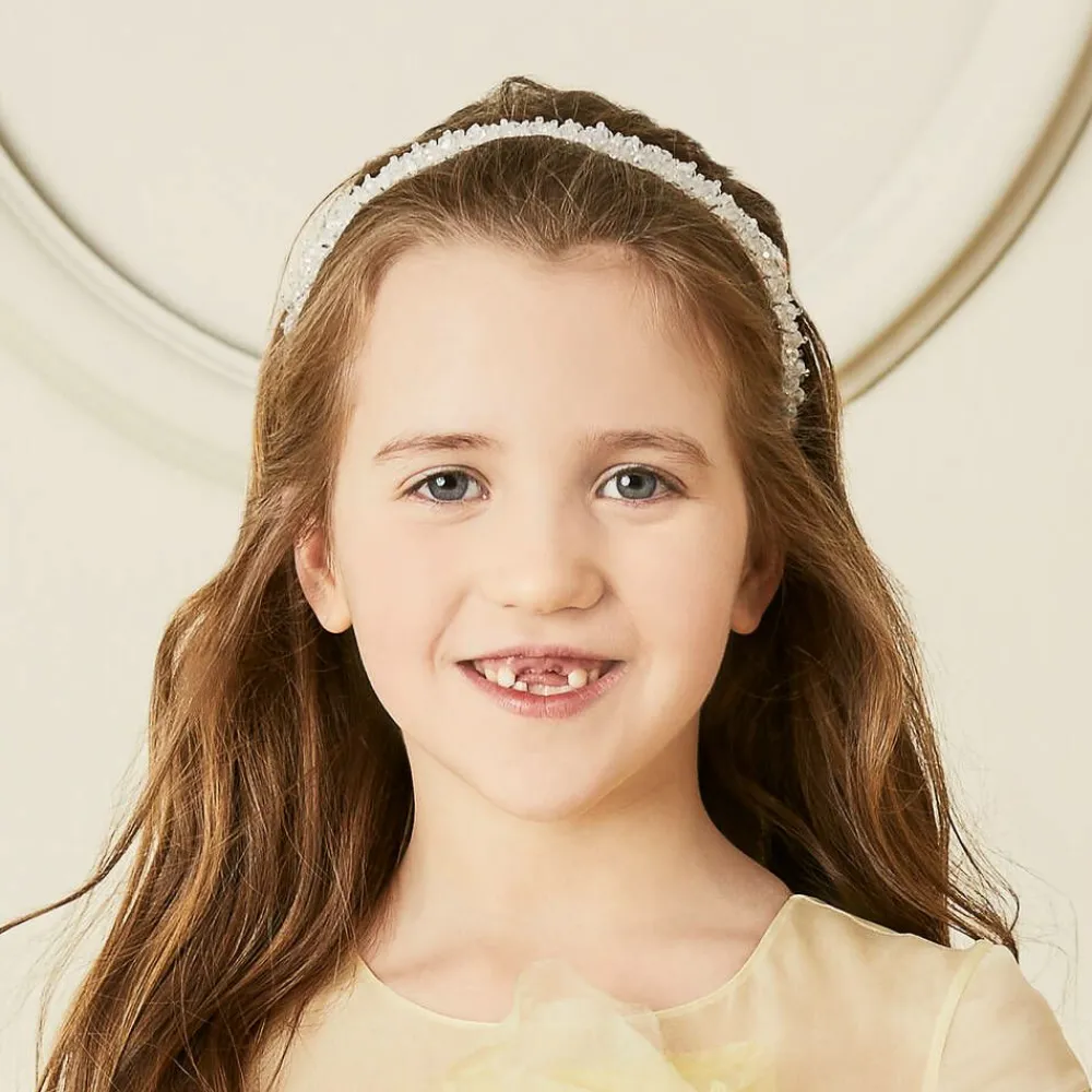 A stunning beaded hairband for girls by Sienna likes to party. Lovely to complete an outfit, the white satin-wrapped metal band is embellished with gorgeous clear crystal beads.