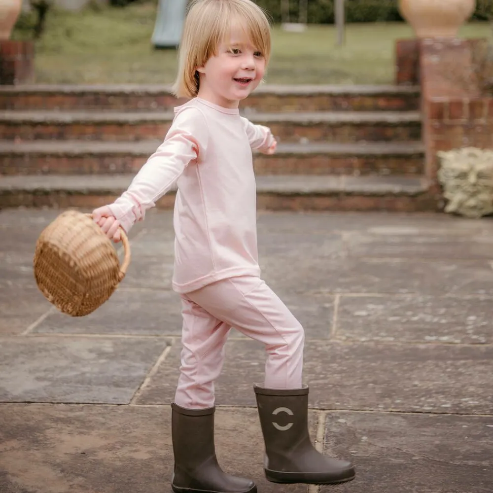 Pale pink top for girls by London-based brand, Smalls Merino. Beautifully soft, this technical top is finely knitted in sustainable ZQ Merino wool for it's warm, moisture-wicking and breathable properties. Gentle against sensitive and eczema-prone skin, this versatile design can also be worn as a warm base layer or as comfortable loungewear.