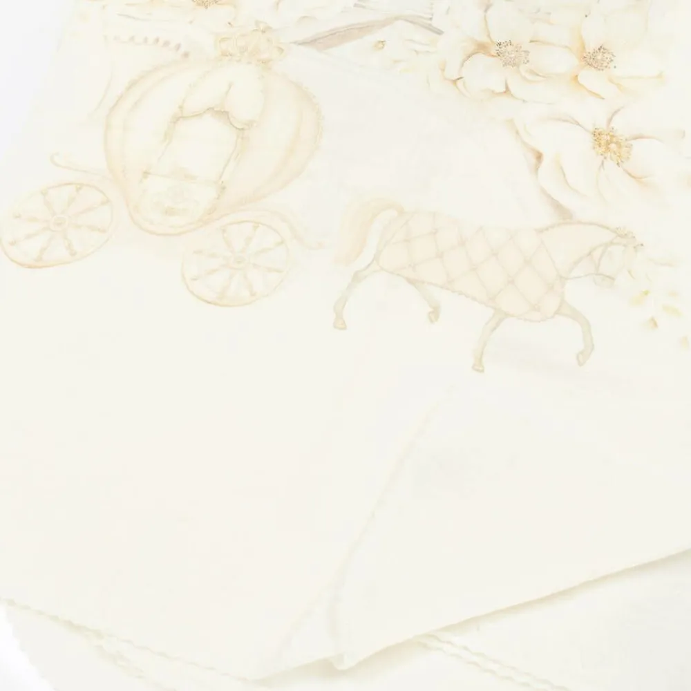 Exclusive to Childrensalon, a pack of two ivory muslin cloths for baby girls by Sofija, made in soft, lightweight cotton. One is plain ivory and the other has a gorgeous fairytale castle and carriage design on the front. These useful, absorbent cloths are great for cleaning up little spills or can be used as a burping cloth or nursing cover.