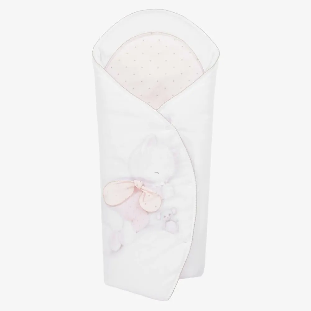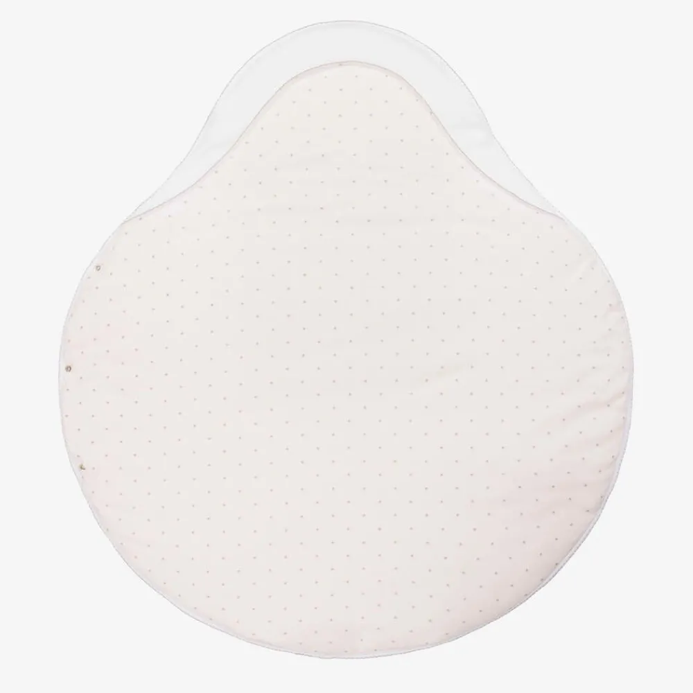 White nest for baby girls by Sofija, exclusive to Childrensalon. Softly padded for comfort, this accessory is made in comfortable cotton jersey for a gentle feel against baby's skin. It has a pale pink lining with glittery silver stars and an adorable kitten print on the front. The knotted bow appliqué and the delicate beige picot trims add lovely finishing details. The nest has a removable coir mat, allowing for a firmer base if required.