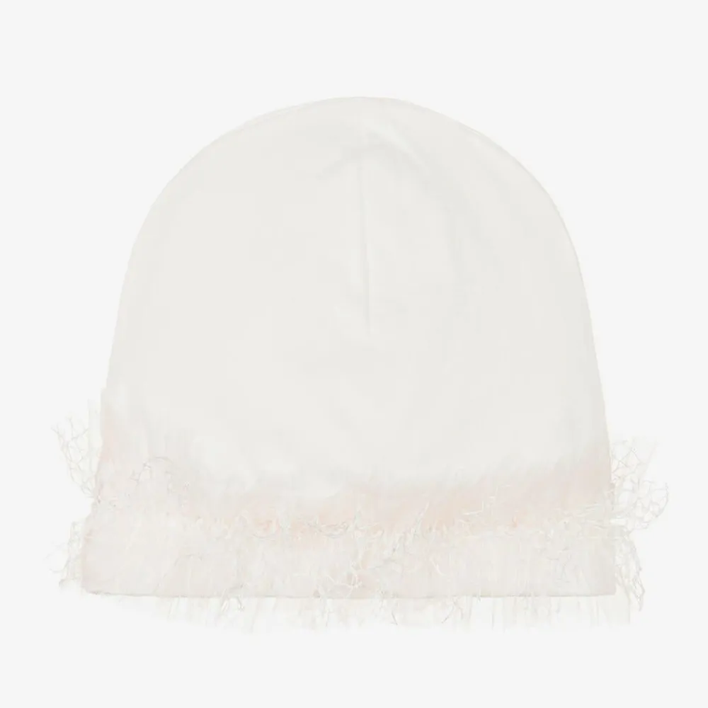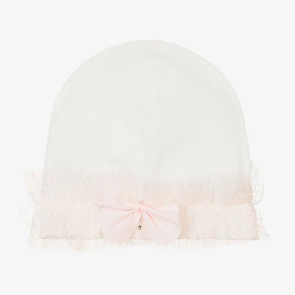 A pretty ivory hat for baby girls by Sofija, made in soft cotton jersey. Trimmed with pink tulle, a small pink bow and diamanté, it has an elasticated trim.