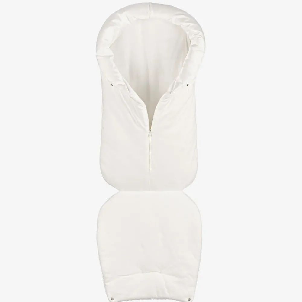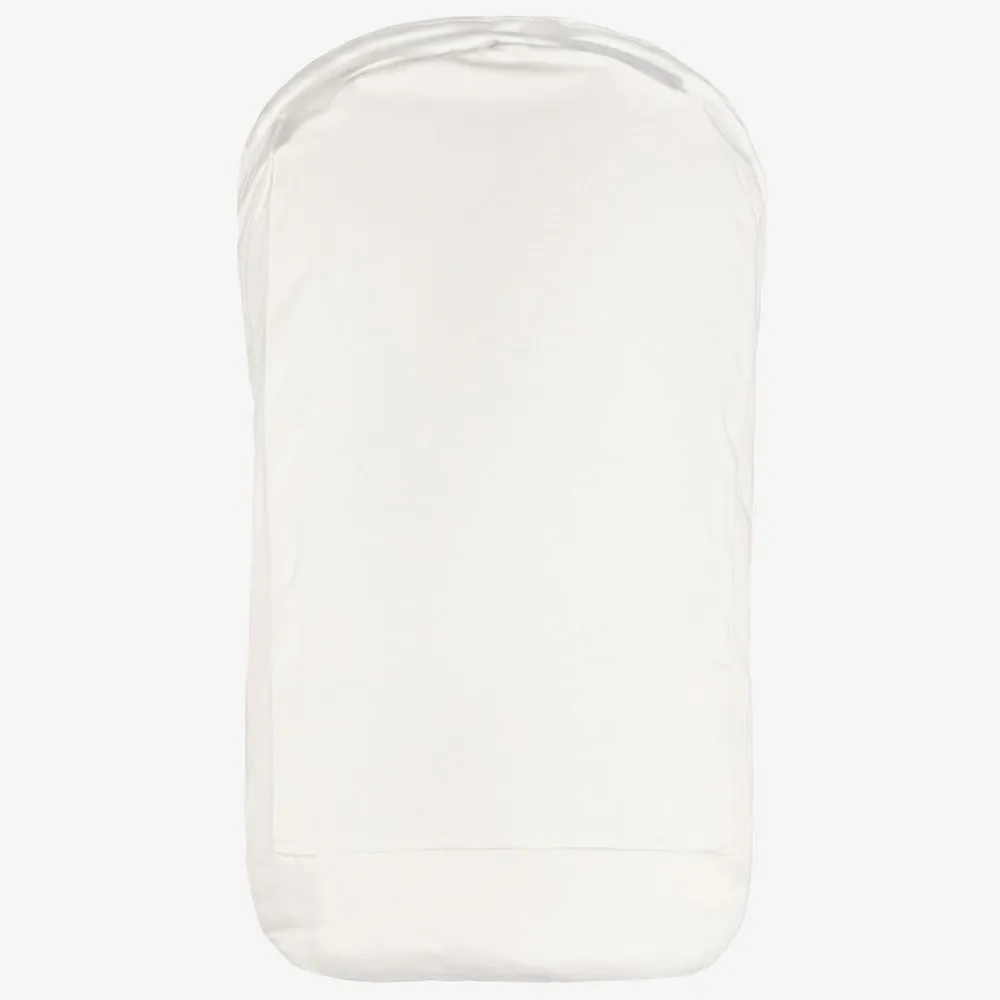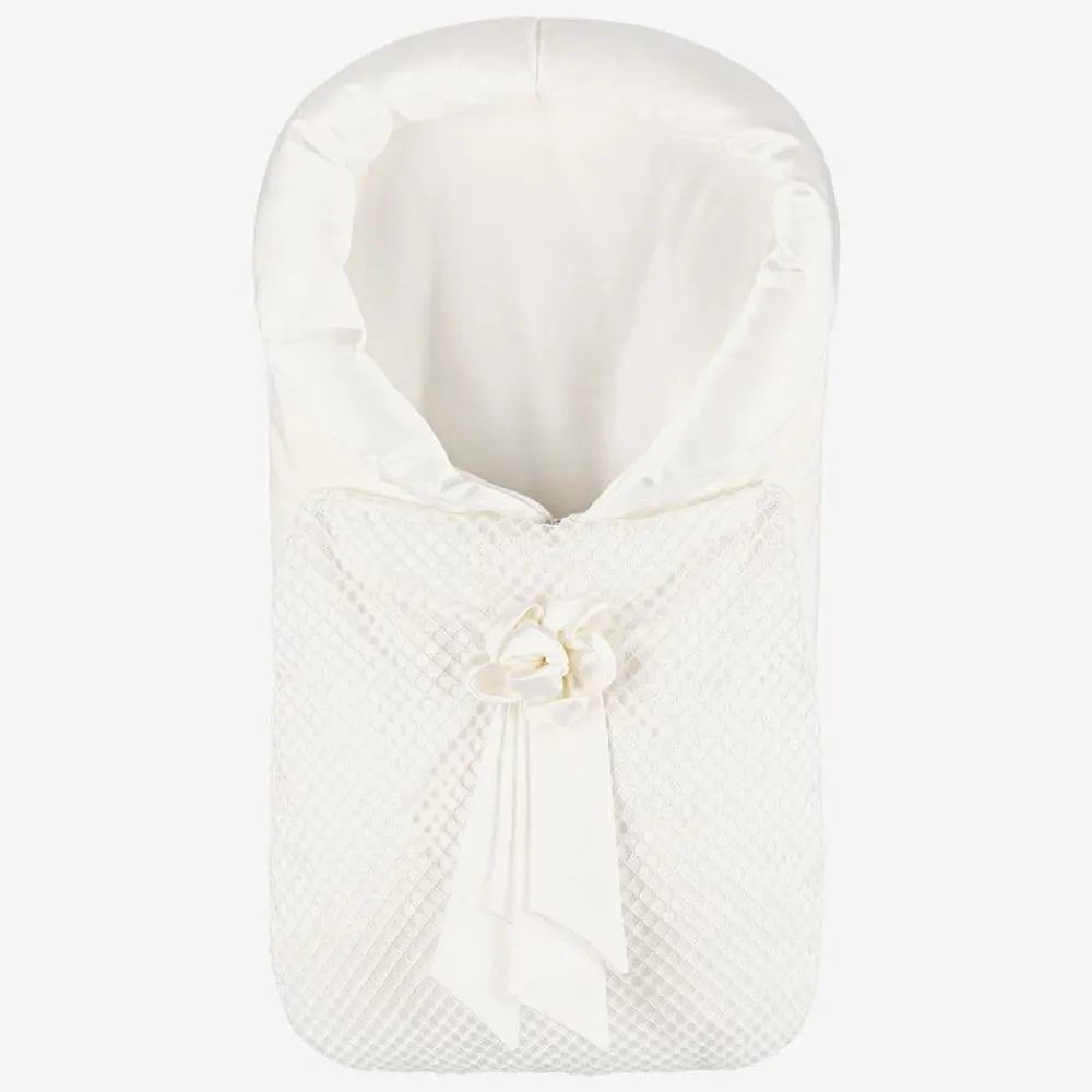 A soft ivory baby nest by Sofija made from stretchy cotton jersey. This lightly padded nest has a diamond and daisy lace overlay on the front, with a silky rosette and matching trims. It has poppers and a zip to fasten, with a removable coir mat that allows for a firmer base if required.