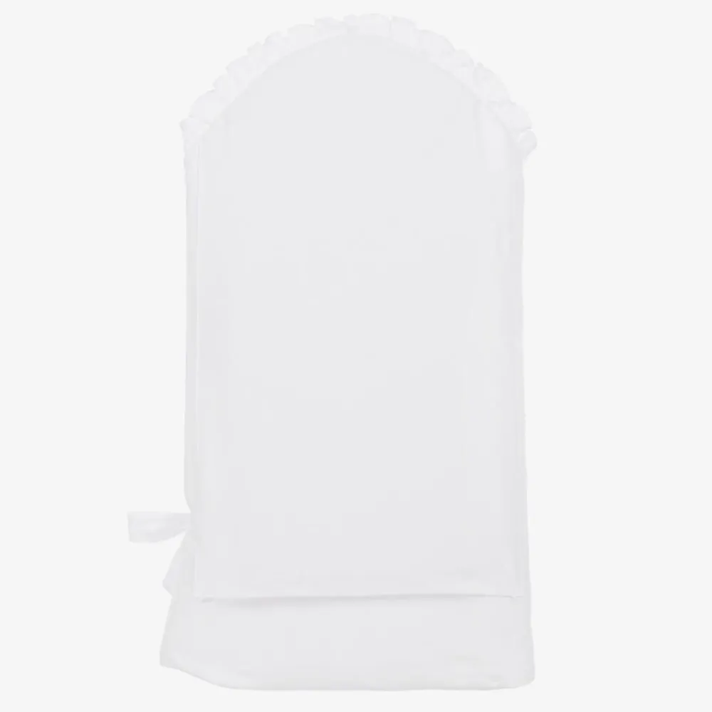 Exclusive to Childrensalon, a white nest for baby girls by Sofija, made in soft and stretchy cotton jersey. This padded nest has a pretty heart shaped floral print on the front, with ruffle trims and a tie fastening. It has a zip fastening inner pouch and a removable coir mat on the back to allow for a firmer base if required.