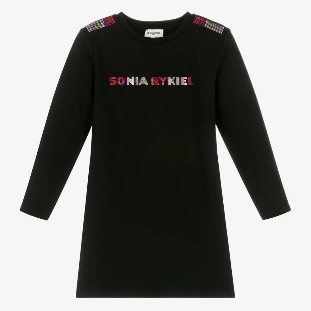 Black dress for girls by Sonia Rykiel Paris, made in soft and mid-weight Milano jersey. This sweatshirt style dress has long sleeves and a round neckline to balance style with comfort. The designer's name can be seen on the front in multicoloured diamantés, matching the sparkly trims on each shoulder.