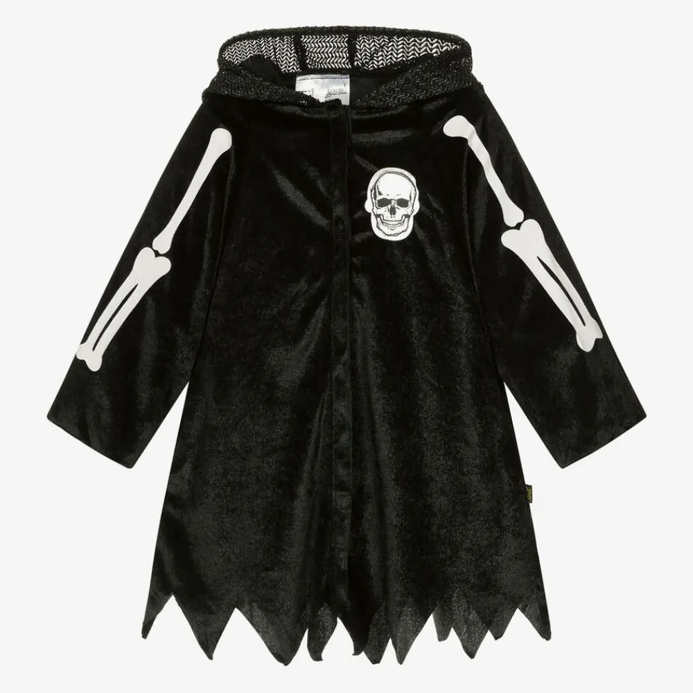 Fun black velvet dressing-up cape for boys and girls from Souza. It has a sheer mesh hood, with bones printed in white on the back and arms for added character. The front fastens with easy-to-use velcro and there is a metallic silver skull patch on the chest.