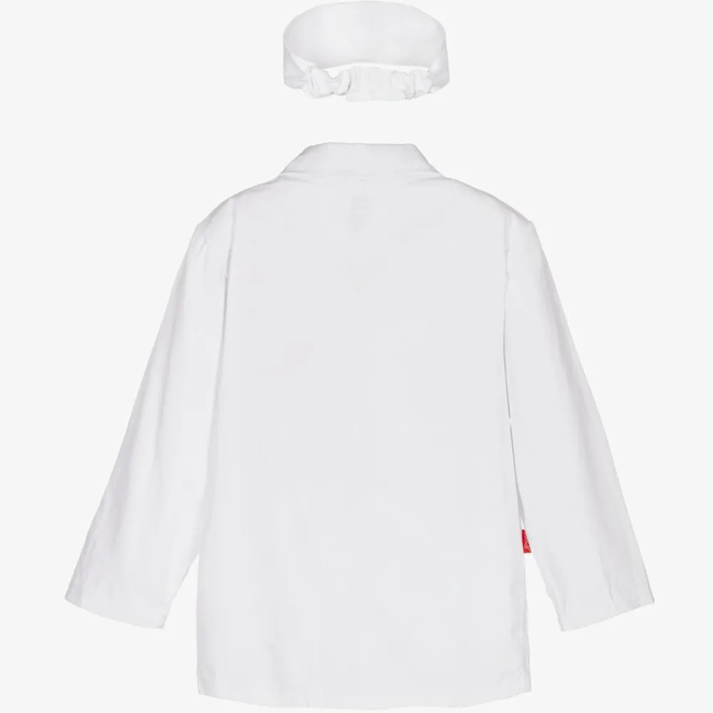 A doctor dressing-up set for boys and girls by Souza, accompanied with four wooden toys and a name tag for a fun imaginary play. The white cotton twill jacket and headband are embroidered with red and white motifs. There are transparent pockets on the jacket and elasticated straps on the headband, both fasten easily with velcro tabs.