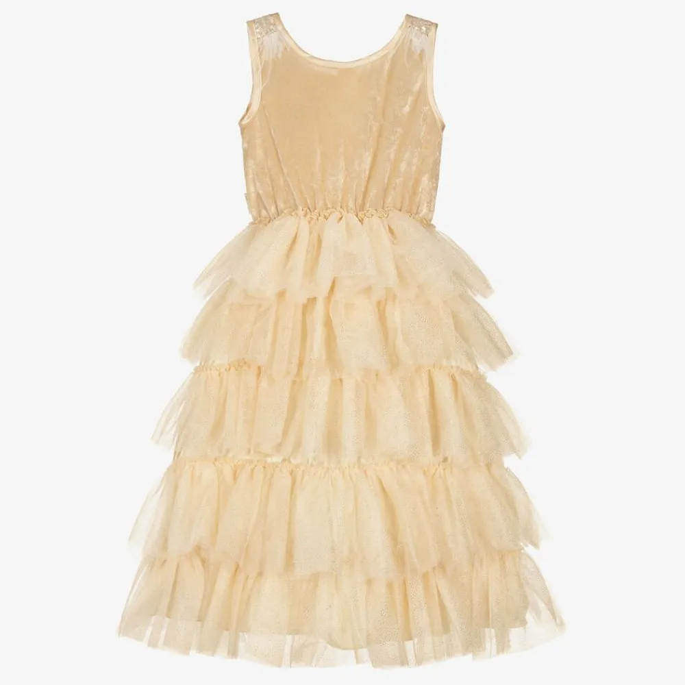 She will transform into a princess with this gold, sparkling party dress for girls by Souza. The fitted bodice is covered in dazzling sequins and has a cosy velour back. The voluminous, ruffled skirt creates a stunning silhouette and is lined with a soft, silky material, ensuring comfort on all the adventures this dress takes her on.