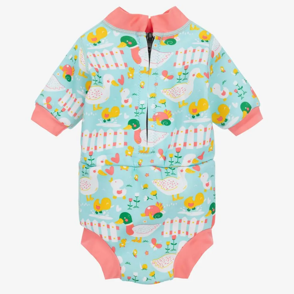 A cute light blue wet suit for baby girls by Splash About. Made from soft and supple neoprene with UPF 50+, it helps to keep baby warmer in the water. In a brightly coloured duck print, this practical suit has three quarter length sleeves for coverage and a zip on the back to help make changing easier. An ideal alternative to disposable swim nappies, it has an integrated nappy which fits snugly on the waist and thighs to help protect against leaks in the pool. Recommended by UK swim schools, it has a lightweight feel with snug pink trims on the neck, arms and thighs for added warmth and comfort. It can be worn with the brand's nappy liner for added protection in the water and ease of cleaning.