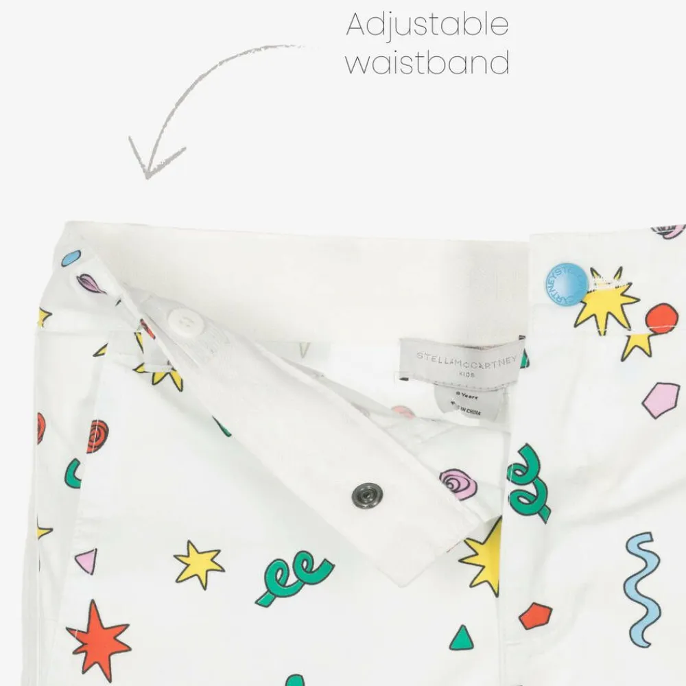 Ivory organic cotton shorts for boys by Stella McCartney Kids, with a fun and colourful printed pattern. They have an adjustable waist for an ideal fit, with a hook and button fastening. There are front and back pockets, with a magic-themed patch and signature logo tab to finish.