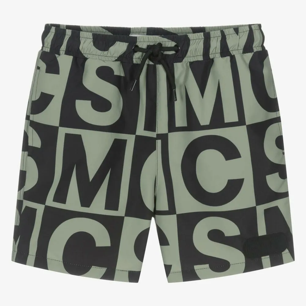 Boys black and green swim shorts by British brand Stella McCartney Kids, patterned with the designer's SMC logos. Made in silky, lightweight, recycled fabric, they have a black rubberised logo on one leg, useful, concealed side pockets and a drawstring waistband for a good fit. They have a lightweight mesh lining for comfort. The Stella McCartney fit can be quite small so choose a size up if you want room to grow.