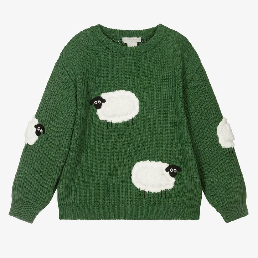Cosy and comfortable for boys, this green sweater is by Stella McCartney Kids. With a fun farmyard theme, it features all-over fleecy white sheep appliqués with embroidered detailing. Made in a soft organic cotton and wool knit, this relaxed style has long sleeves and ribbed trims. The Stella McCartney fit can be quite small so choose a size up if you want room to grow.