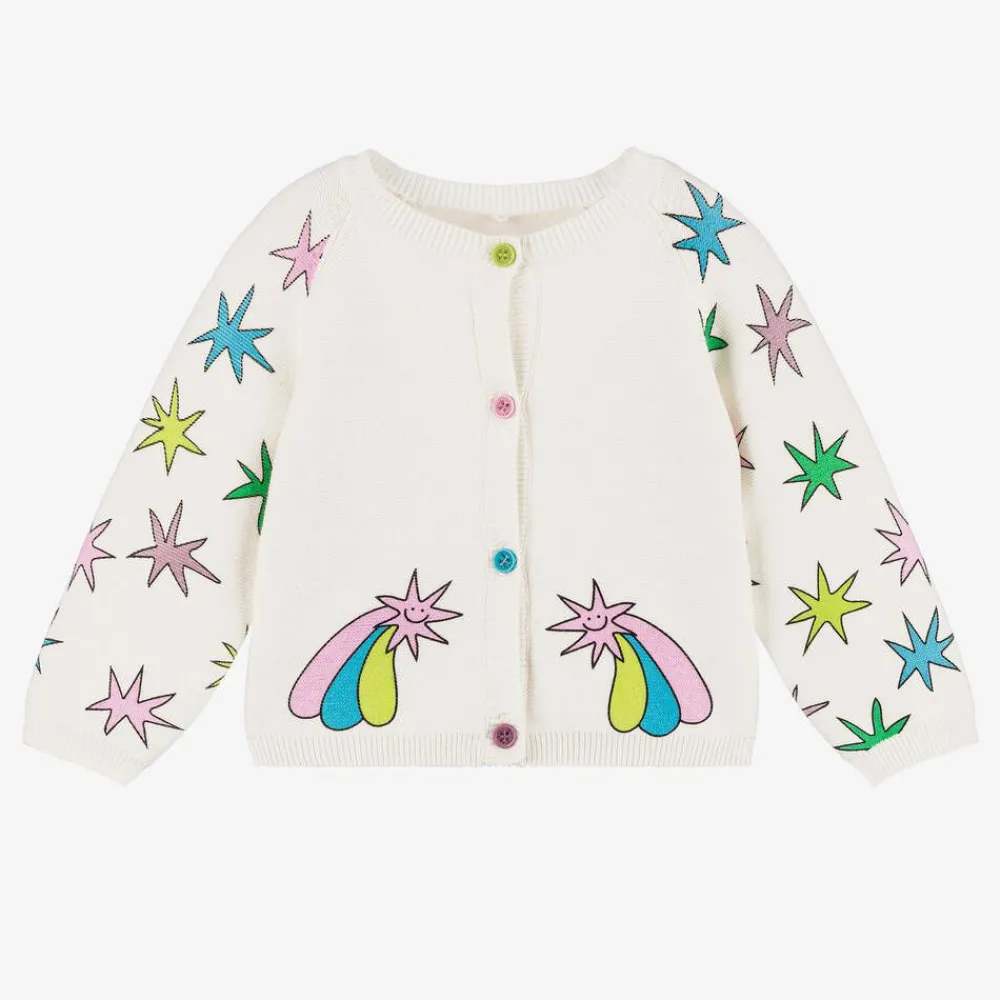An ivory knitted cardigan for younger girls by Stella McCartney Kids, with fun shooting star characters on the front. An ideal layering piece, this playful design has colourful stars printed on the long sleeves and matching, branded button fastenings on the front. It is made in soft, organic cotton with neat, ribbed trims. The Stella McCartney fit can be quite small so choose a size up if you want room to grow.