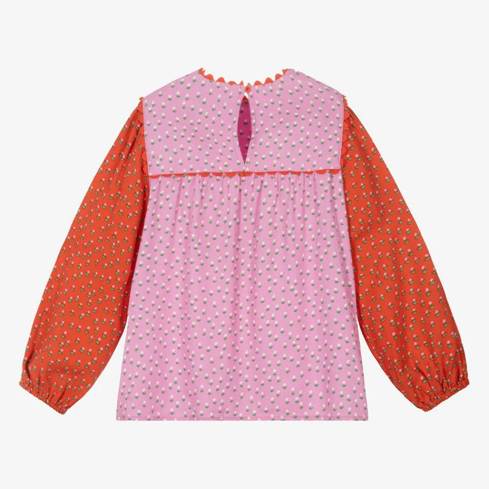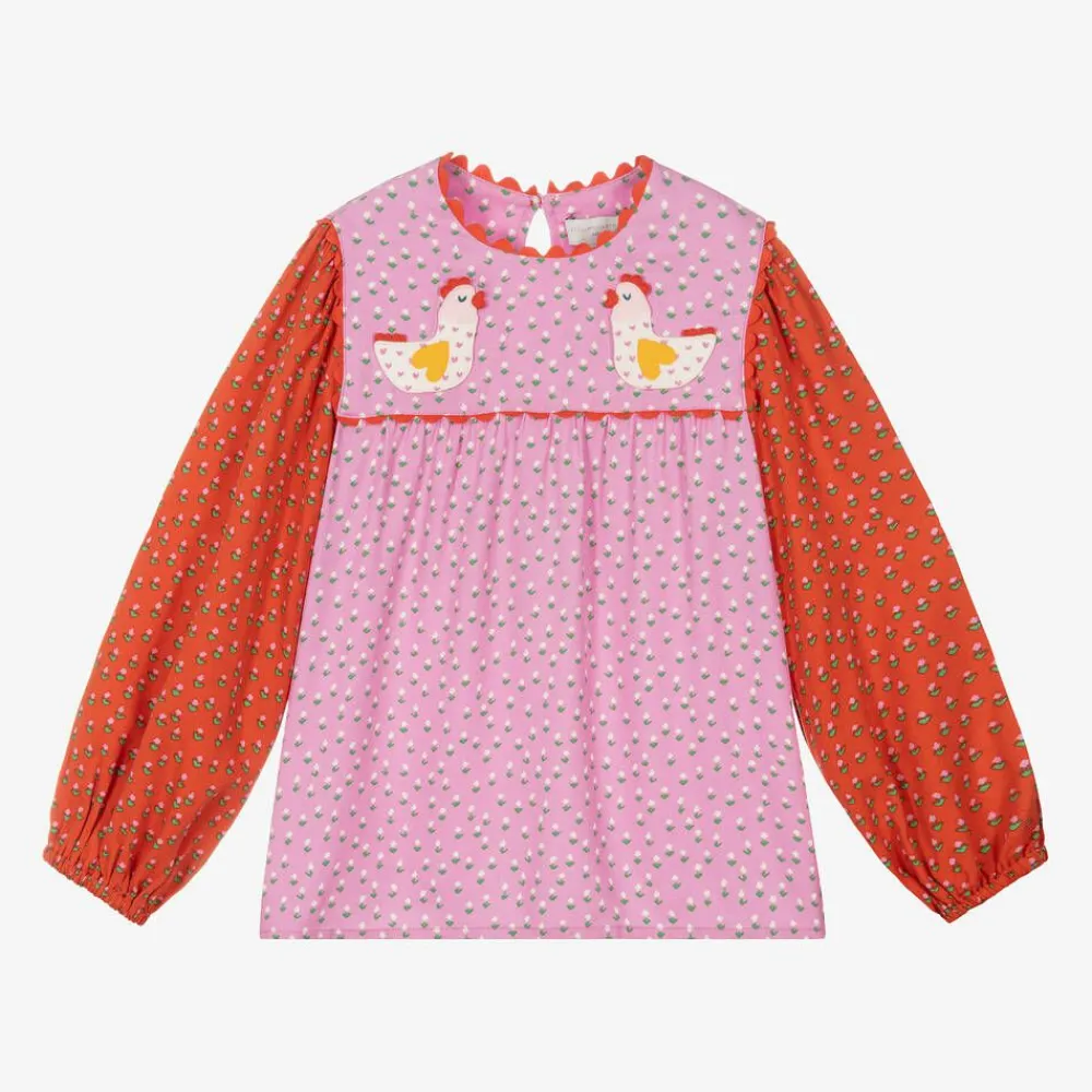 A lovely pink and flame-red blouse for girls by Stella McCartney Kids, patterned with little white pink and green flowers. Soft, flowy and comfortable, it is made from sustainably sourced viscose. This relaxed-fit top is decorated with two cute chicken appliqués and scalloped trims for a sweet vintage look. It has a single button fastening on the back and the gently puffed long sleeves are elasticated on the cuffs.