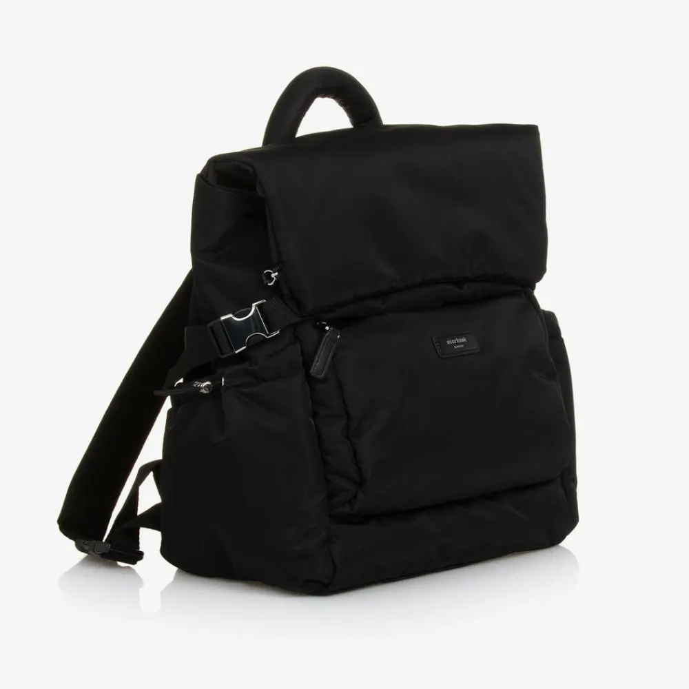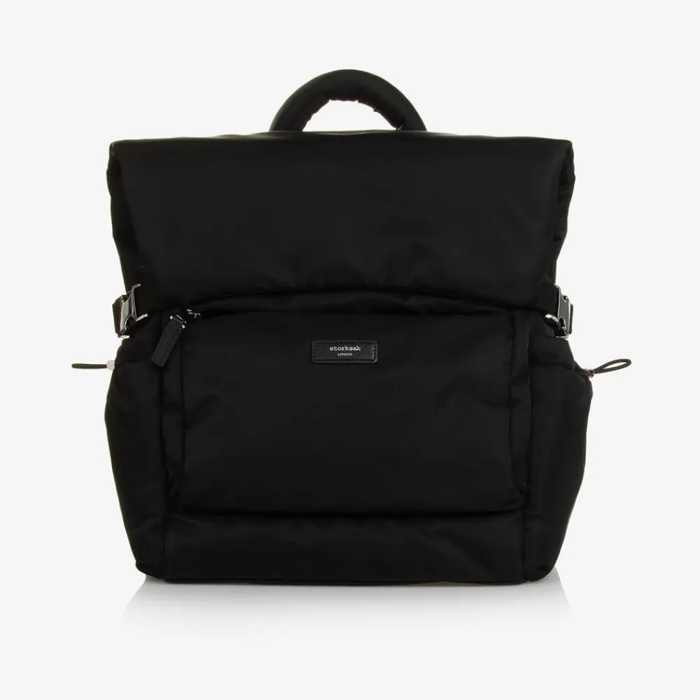 Practical black changing bag by Storksak, ergonomically designed with padded back and shoulder support. Smooth and water repellent, it is made from recycled nylon with silver-tone hardware. The large main compartment is easily accessible with zips from the top and the back. It has multiple internal pockets for easy organisation with an external zip pocket and two side pockets secured with toggles. It is easily converted from a backpack to a shoulder bag with a detachable strap and can be carried securely on a wheeled suitcase when travelling. It comes with an insulated bottle bag and a washable changing, each with velcro fastening carry straps.