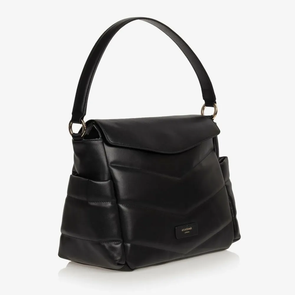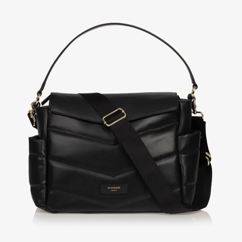 A stylish black leather changing bag by Storksak, with a beautiful smooth feel and quilted detailing. Branded on the front, this versatile design has a spacious compartment with a zip opening and a magnetic flap cover. The lined interior features two elasticated pockets and an insulated sleeve that secures inside with velcro. There are two side pockets for bottles and a discreet zip pocket on the front for storing valuables. This sleek design is styled with a leather shoulder strap and comes with a long detachable strap. This has convenient velcro stroller straps built in for practicality.