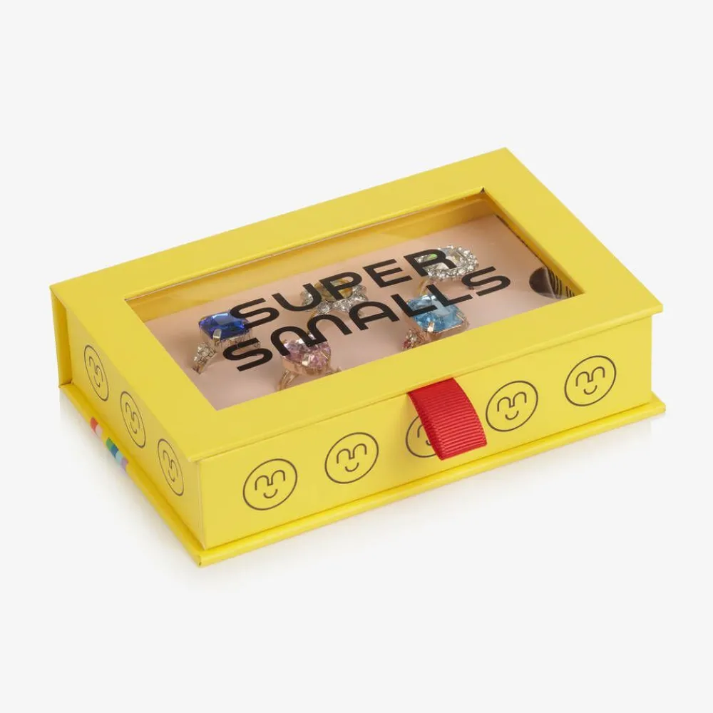 Girls will sparkle and shine in this pink and blue heart bracelets and rings set by Super Smalls. Presented in the brand's signature yellow box, the set includes two elasticated bracelets and two adjustable rings in different designs. Mix and match, or stack them all for a bold look, the sparkly gems are set in gold finish metal frames.