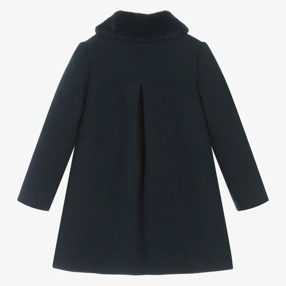 Effortlessly smart navy blue coat for girls by French brand, Tartine et Chocolat. Woven in a soft cotton and wool blend, this traditional coat has a chic, simple design and a silky lining for comfort. It fastens with concealed poppers on the front and has neat flap pockets for little hands. For a cosy touch, it has a plush faux fur collar, which can be detached with discreet buttons.