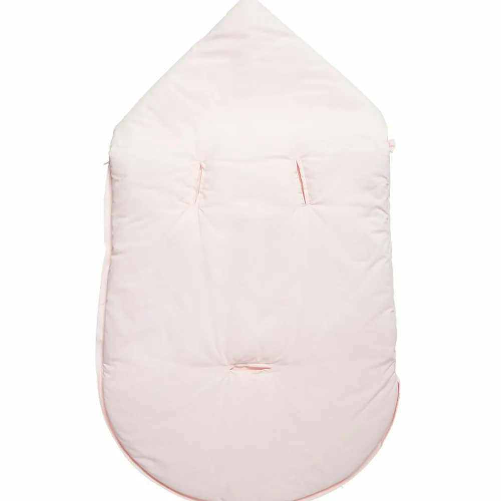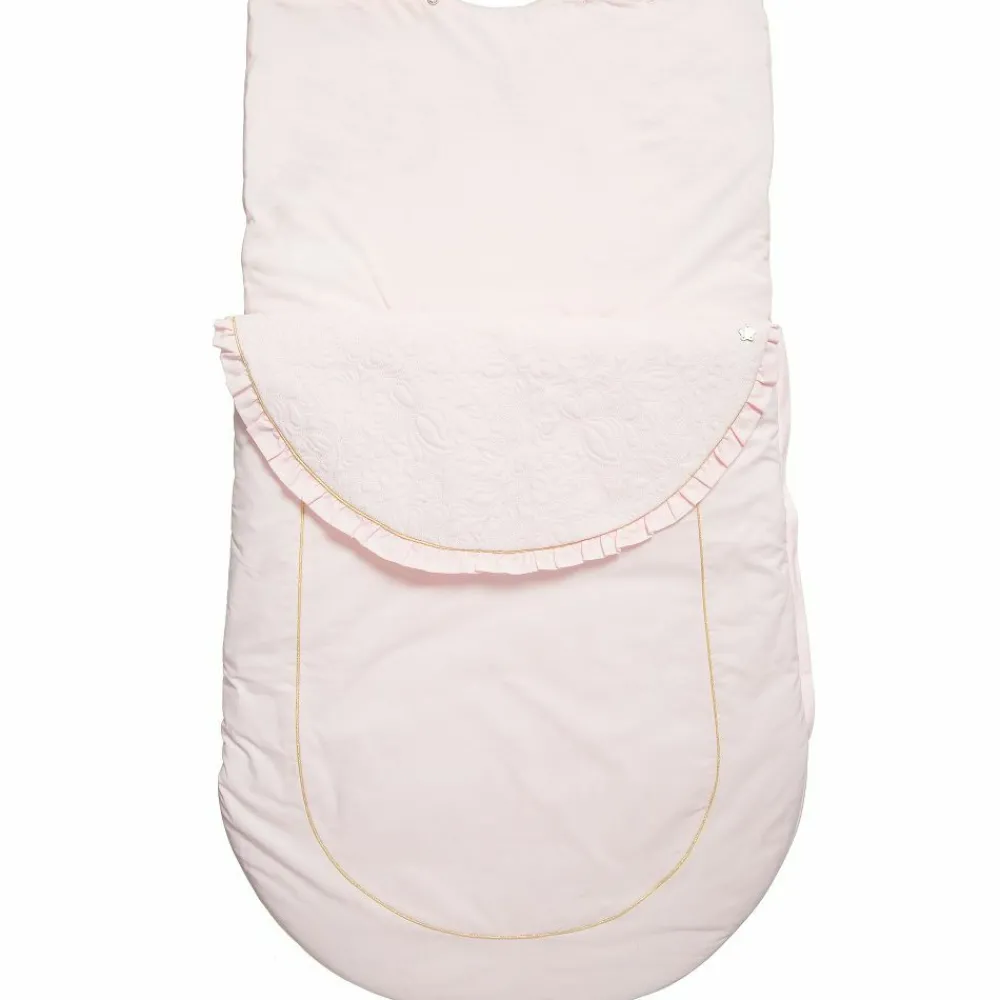 Baby girls pale pink padded nest by Tartine et Chocolat with a beautifully embroidered pink fold-down flap and shiny gold piping. This elegant design is made in soft cotton and is fully lined for extra comfort. It is lightly padded and has a hood fastened with textured gold buttons over poppers, which can be undone to create a pillow. There is a zip fastening down one side and across the bottom, with openings at the back so that baby can be secured to a pram or car seat.