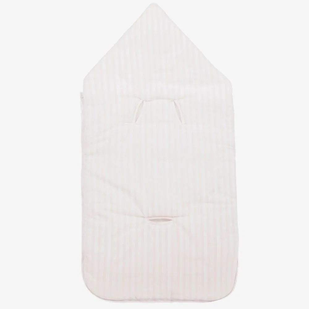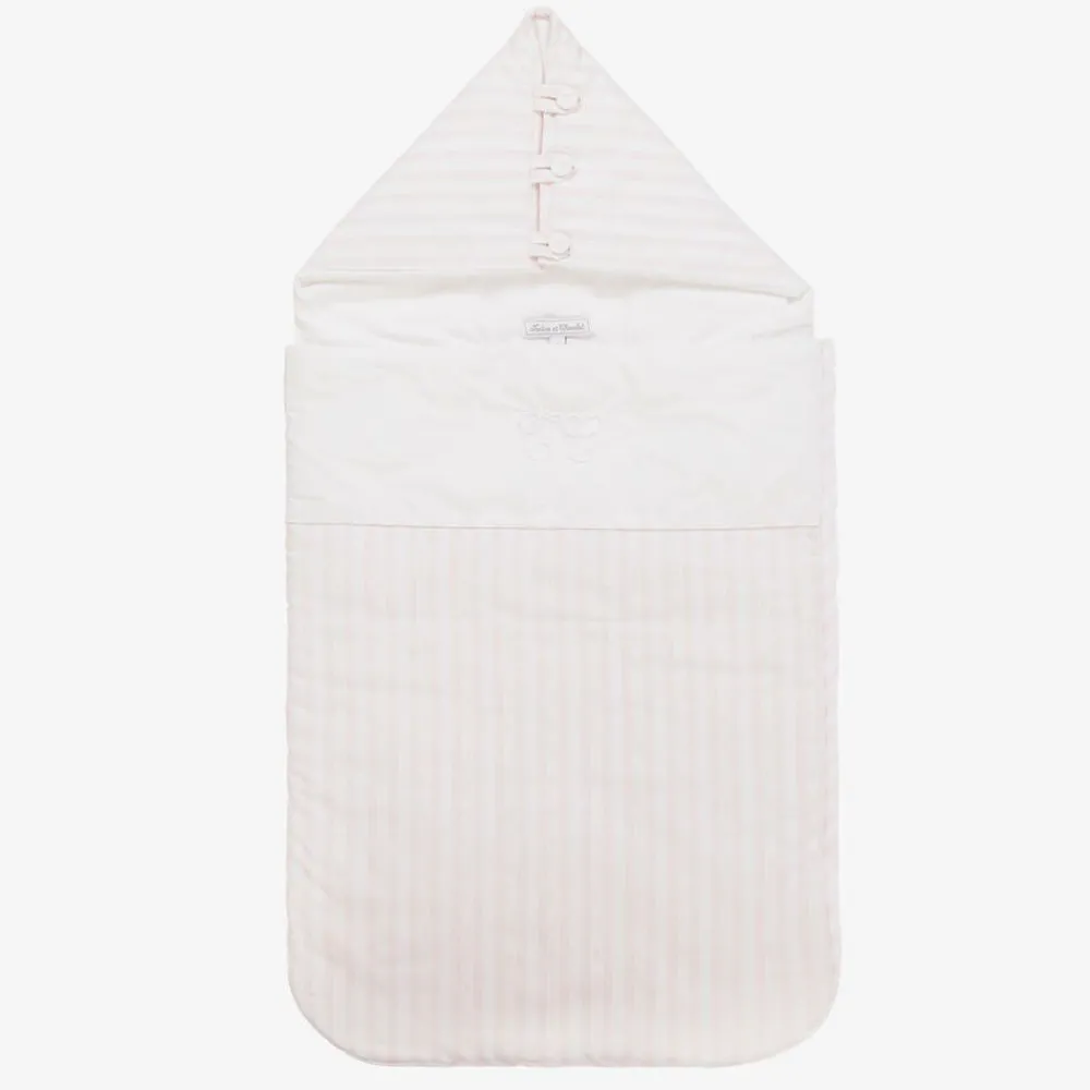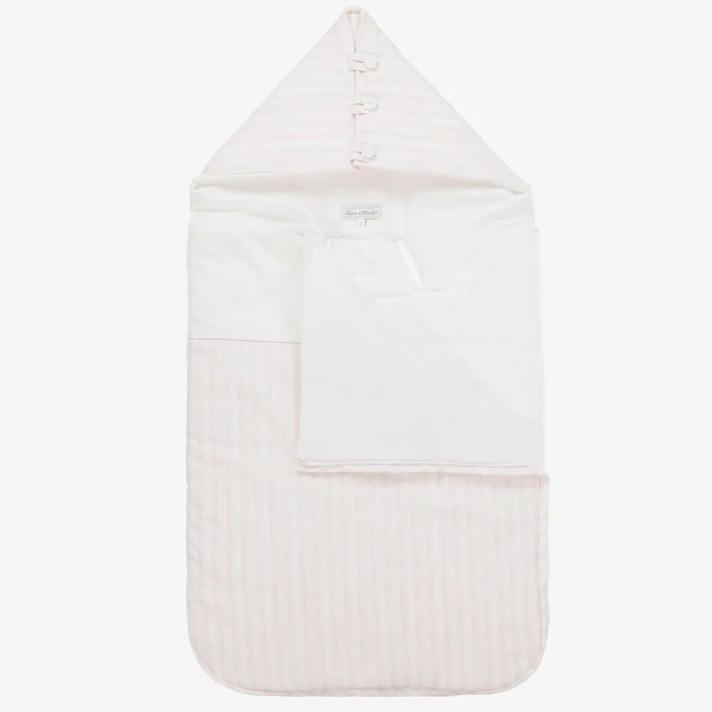 Pale pink and white striped baby nest for girls by Tartine et Chocolat. It is made in soft cotton, with a large embroidered logo on the front. The fabric-covered buttons on the hood can be opened to form a flat surface and the three slits on the back can be used to secure the nest to a car seat or buggy.
