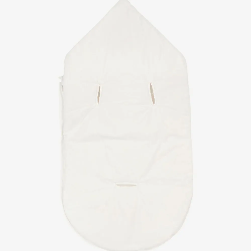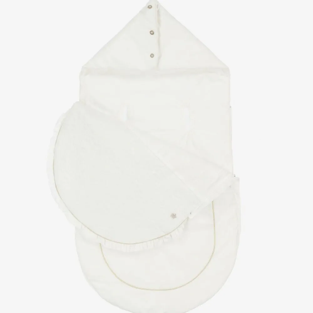 Baby girls ivory padded nest by Tartine et Chocolat with a beautifully embroidered ivory fold-down flap and shiny gold piping. This elegant design is made in soft cotton and is fully lined for extra comfort. It is lightly padded and has a hood fastened with textured gold buttons over poppers, which can be undone to create a pillow. There is a zip fastening down one side and across the bottom, with openings at the back so that baby can be secured to a pram or car seat.