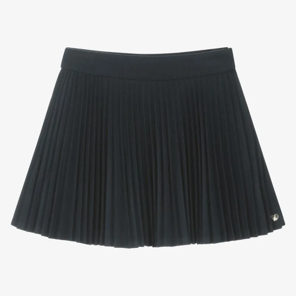 Smart navy blue pleated skirt for girls by Tartine et Chocolat, made in a beautifully soft viscose blend with a satin lining. Fastening with a button and a concealed side zip, it has an adjustable waist for a comfortable fit. A small heart logo charm above the hem adds a subtle branded touch.