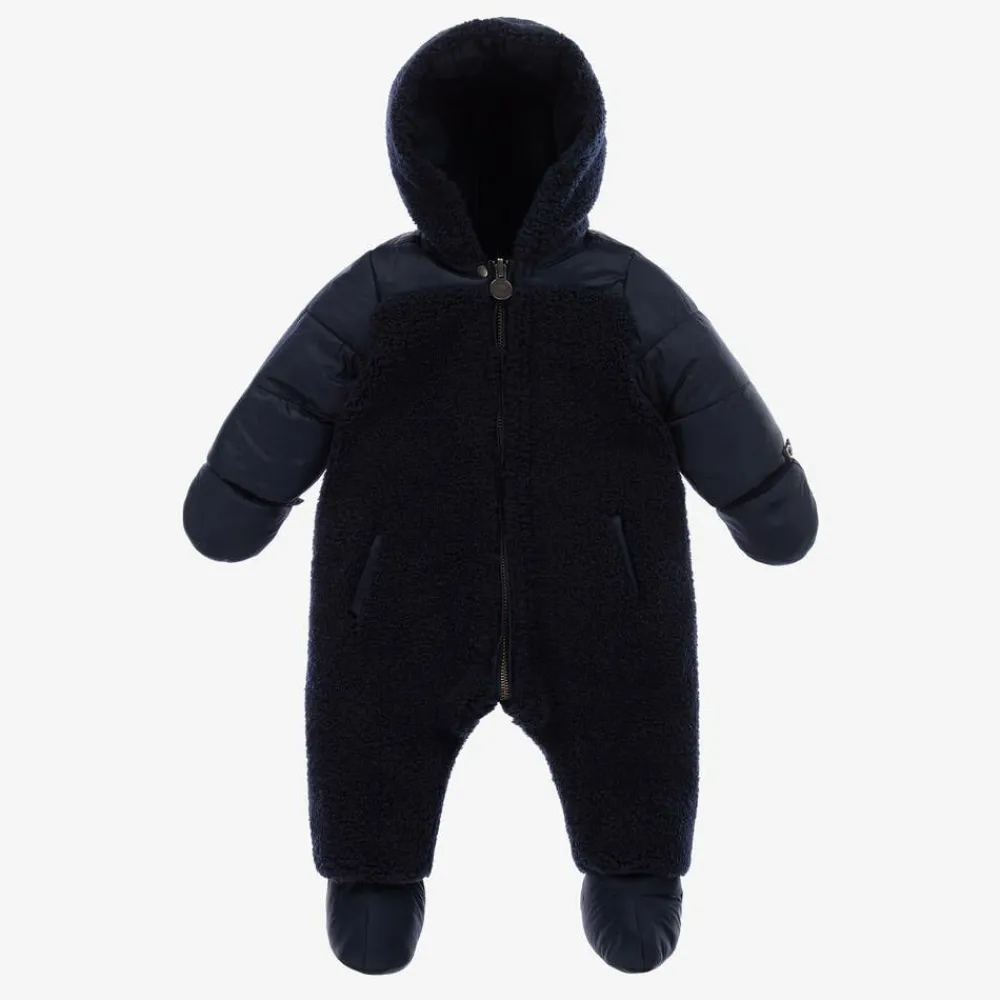 Reversible for two different looks, this navy blue hooded snowsuit for baby boys and girls is by French brand Tartine et Chocolat. Trimmed with navy blue and white striped ribbing, one side is silky smooth and in a puffer style, with a rubberised logo on one sleeve. The other side is made in soft, cosy teddy fleece, with silky smooth trims. Softly padded for warmth, both sides have useful pockets, with a zip and popper fastening down the front. There are coordinating detachable mittens and booties, secured with poppers to prevent them from becoming lost.