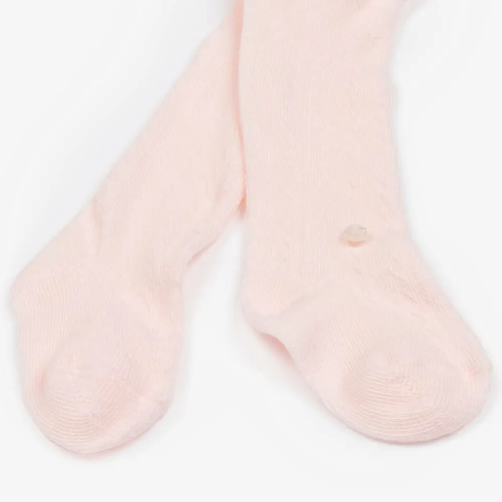 Pretty pale pink tights for girls by French brand Tartine et Chocolat. Knitted in a soft and stretchy cotton blend, they have a delicate pointelle pattern and a pearly logo disc on one ankle.