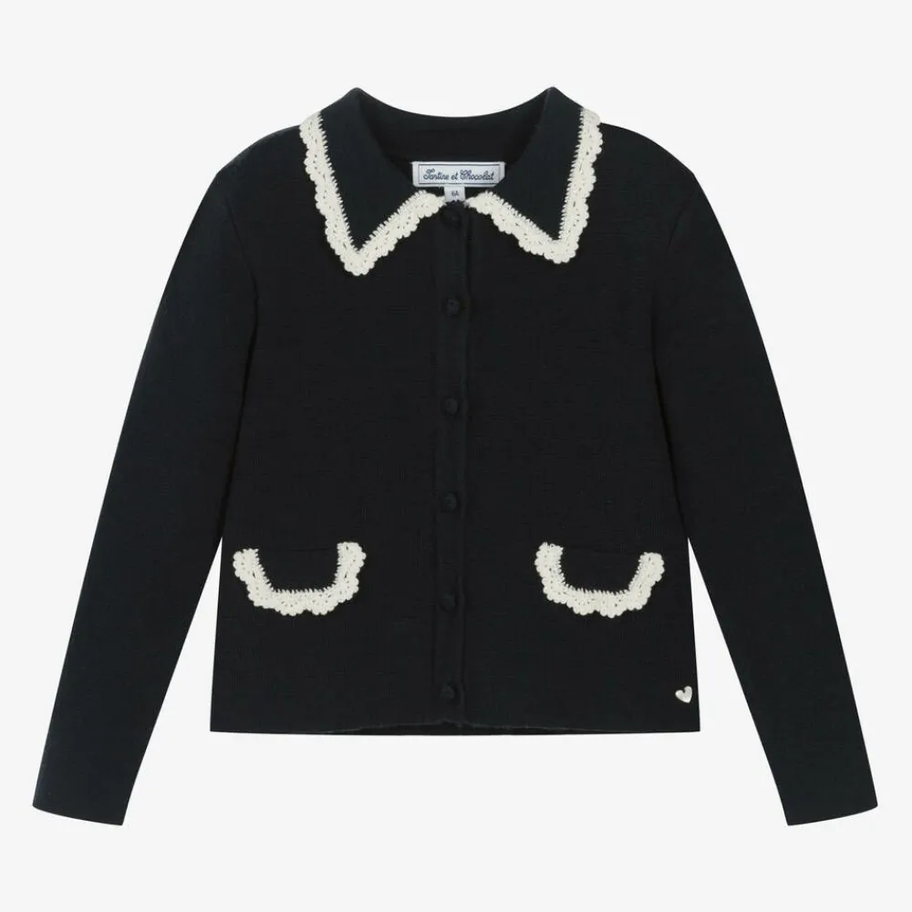 Lovely navy blue cardigan for girls by Tartine et Chocolat. Softly knitted in a cosy wool blend, this long-sleeved layering piece has ivory crochet detailing on the collar and the faux front pockets. A small heart logo charm is embroidered near the hem for a designer finishing touch.