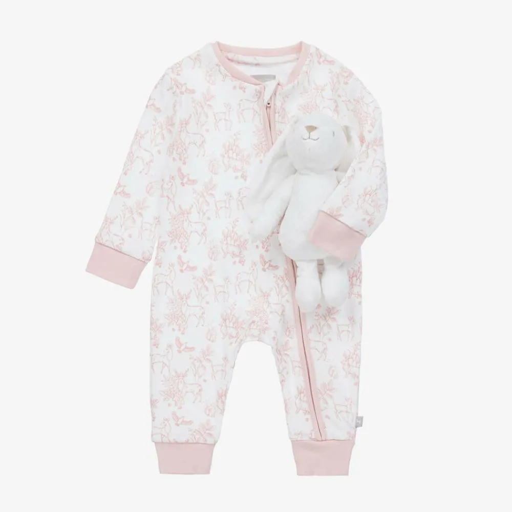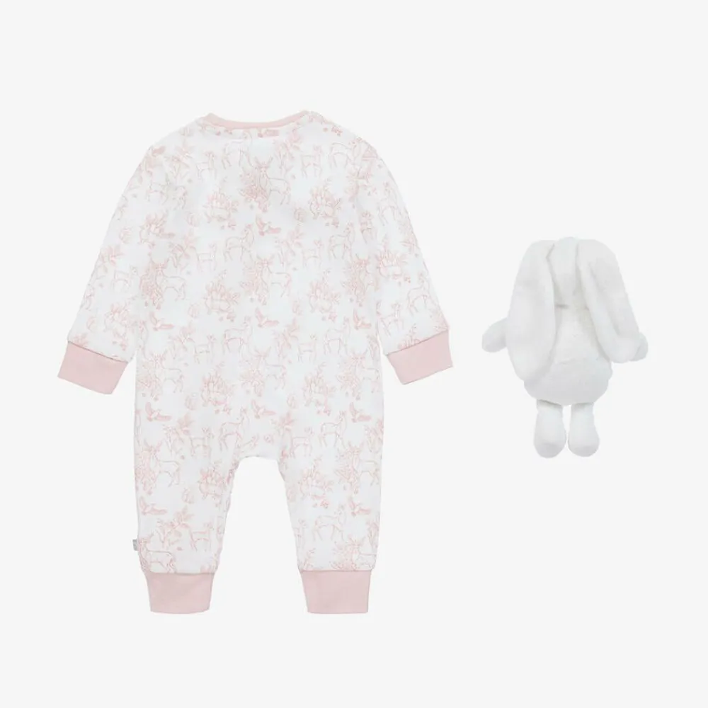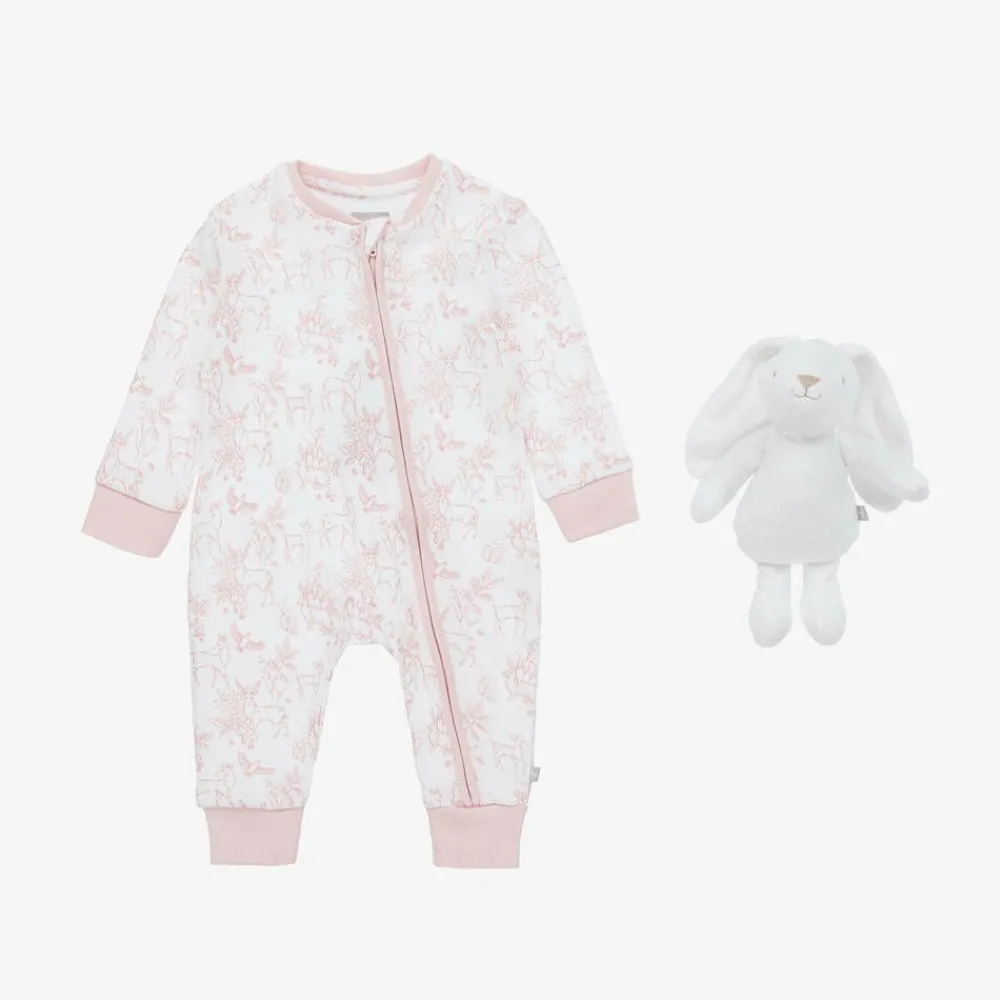 Sweet white babysuit gift set for little girls by British brand, The Little Tailor. The white romper has a cute pink deer and woodland print. It smoothly fastens with a zip on the front, covered by a protective chin guard, for easy dressing. The babysuit set is completed by an adorable plush bunny toy, which makes a cuddly companion for your little one. Lovely as a gift for a special new arrival, it comes with a rocking-horse print gift bag and a card.