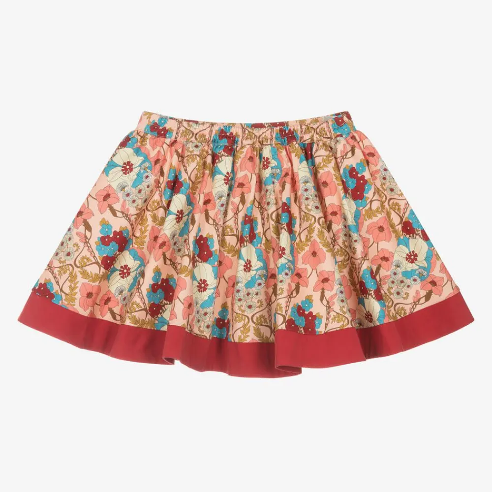 Coral pink skirt for girls by The Middle Daughter, patterned with 60's inspired florals. Woven in soft cotton sateen, this circle skirt has a flared silhouette and a deep red trim around the hem. It is lined in beautifully lightweight cotton for comfort and has a part-elasticated waist for a great fit.