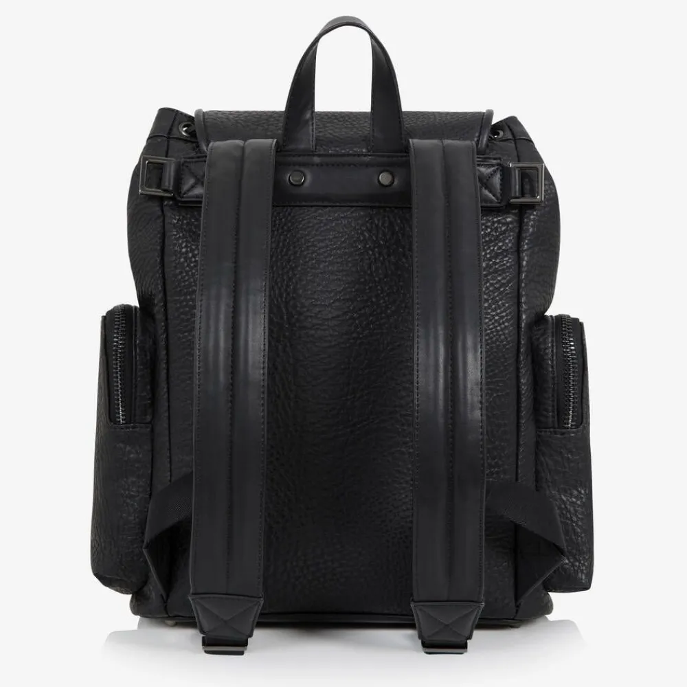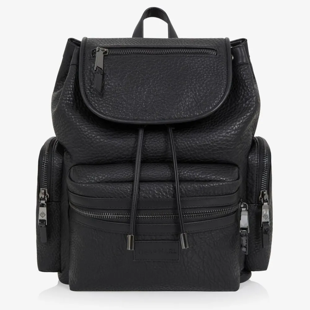A smart black changing backpack by TIBA + MARL. It is made in smooth, recycled faux leather with a water-resistant and easy-to-wipe-clean, recycled woven lining. Inside the spacious main compartment, there is a useful laptop pocket, an insulated bottle holder, and an additional elasticated pocket. Stitched with a tonal logo patch, there is a large zipped pocket on the front and two zip-up pockets on the sides, one with insulated lining for extra practicality. Fastening with a drawstring and a magnetic clasp, the front flap has another zipped pocket for small essentials. The back panel and the adjustable straps are padded for added comfort and there is a top handle that can be easily hung on a hook. The D-rings on the sides can be attached to stroller clips (sold separately), and it comes with a zipped pouch and a padded changing mat.