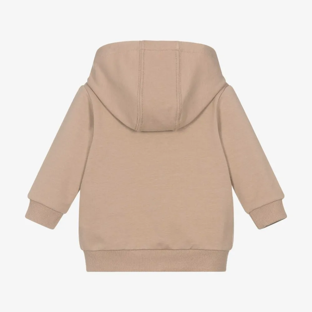 Beige organic cotton zip-up hooded top for baby boys by American brand Timberland, just right for relaxed days. Made in soft jersey with a brushed feel inside for cosy comfort, it has neat, ribbed trims and a slightly off-centre patch pocket on one side, printed with the label's signature tree logo in white. The exposed, bright orange zip fastening on the front has a useful, protective, chin guard.