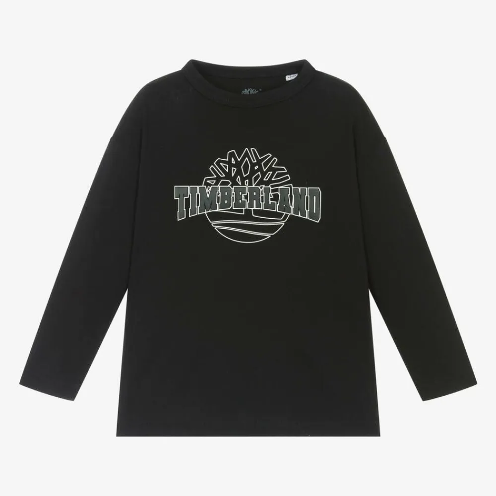 Black long-sleeved top for boys by Timberland, made in soft organic cotton jersey. Cool and comfortable, this casual top features a rubberised grey and white logo printed on the front along with the brand's iconic tree illustration.