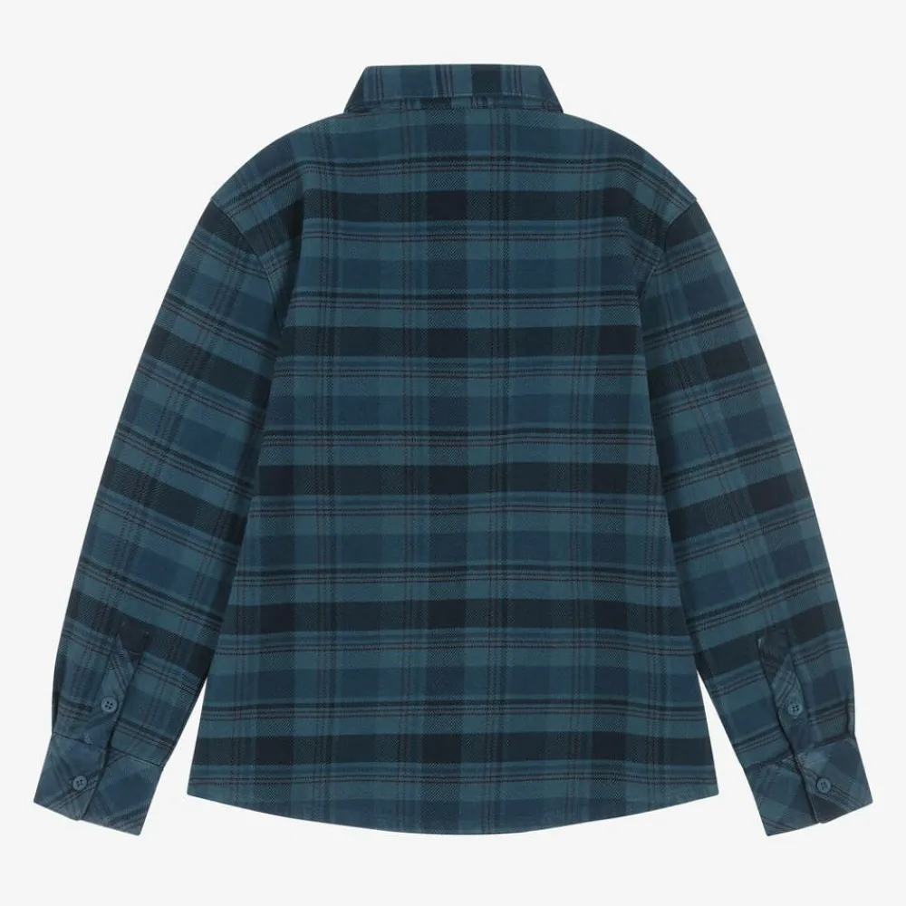Checked shirt in shades of blue for boys by American brand Timberland. Made in mid-weight cotton twill, it has a patch pocket on the front, with the signature tree logo badge. It has long sleeves and fastens with branded buttons on the front and cuffs.