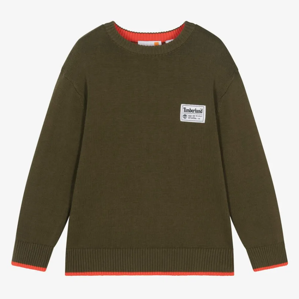 Khaki green cotton jumper for boys by Timberland, with contrasting orange tipping on the ribbed trims. Softly knitted, this classic style has a ribbed crew neck and an embroidered logo patch on the chest adding an unmistakable designer touch.