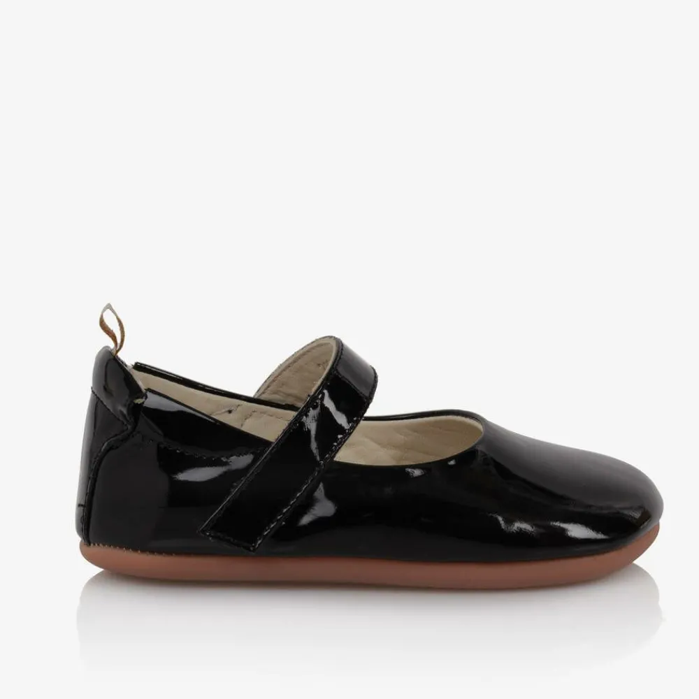 Shiny black patent leather shoes for baby girls by Tip Toey Joey. A comfortable design, they have stretchy elastic around the back of the heel to help slip them on and off little one's feet. They have a lightly padded leather insole and a velcro strap that can be easily adjusted for a secure fit. The flexible, non-slip rubber sole helps with balance and supports confident first steps.