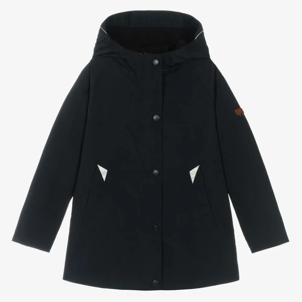 Navy blue hooded raincoat for boys and girls by British brand Töastie, made in soft recycled polyester from plastic bottles. Waterproof and breathable, it has taped seams and a soft thermal jersey lining. It has fleece lined, popper-fastening hand-warmer pockets, light reflective trims on the front pockets and back hem and micro-fleece soft chin guard for extra wind protection.
