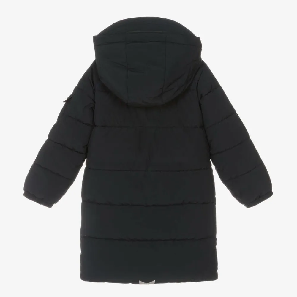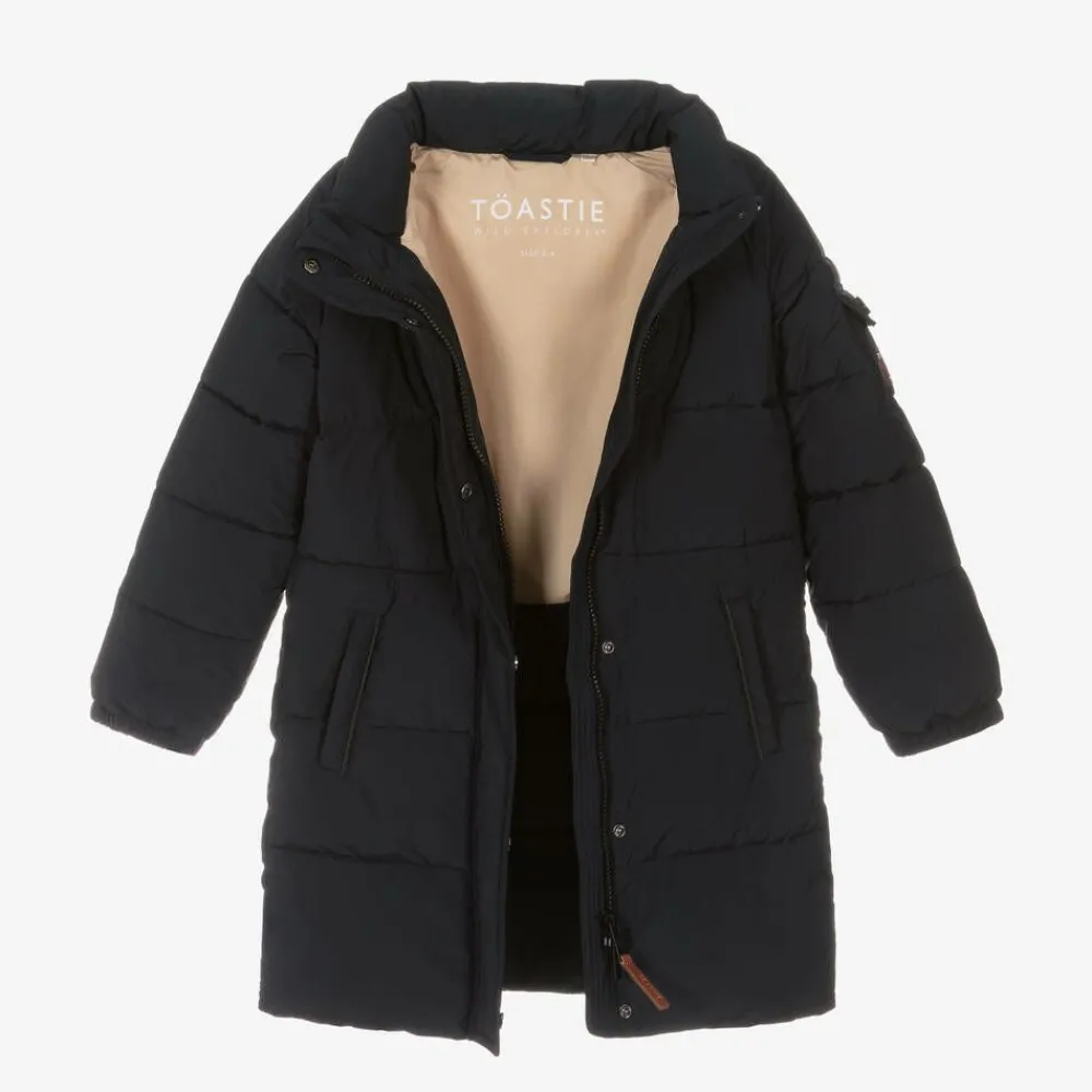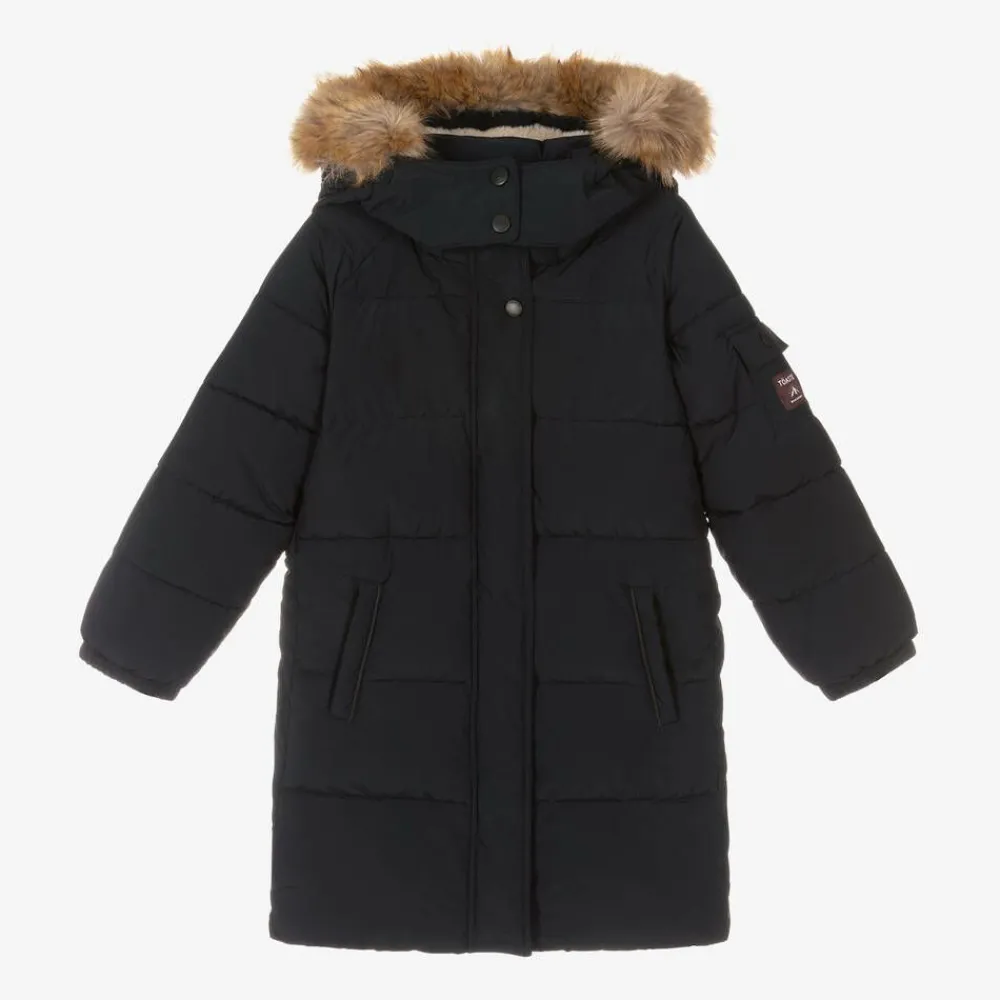 Navy blue hooded parka coat for girls by British brand Töastie. The exterior is water-repellent and made from recycled materials, with breathable padding and a comfortable lining. The spacious, peaked hood is lined in cosy fleece and has a detachable, soft faux fur trim. There are practical pockets and it fastens with a zip beneath a popper storm flap. The brand's logo patch can be seen on one sleeve to complete the look.