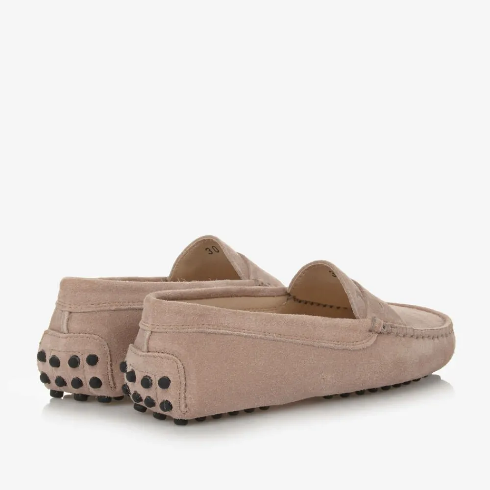 Classically styled beige Gommino moccasin shoes for boys and girls by luxury Italian brand Tod's. Handmade in soft suede leather, these slip-on shoes have traditional stitched detailing around the toes and an embossed monogram logo on the front. The smooth leather lining provides lasting comfort, whilst the designer's signature pebble grips on the suede outer sole ensure good grip.