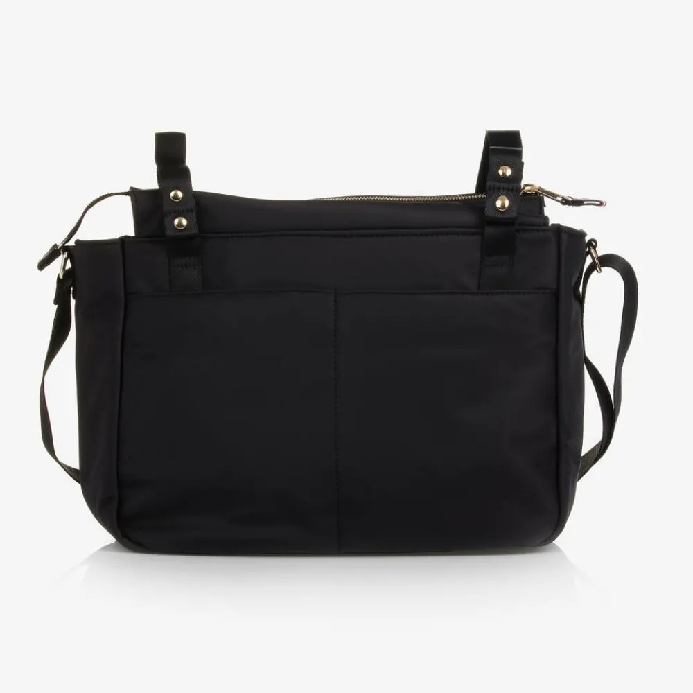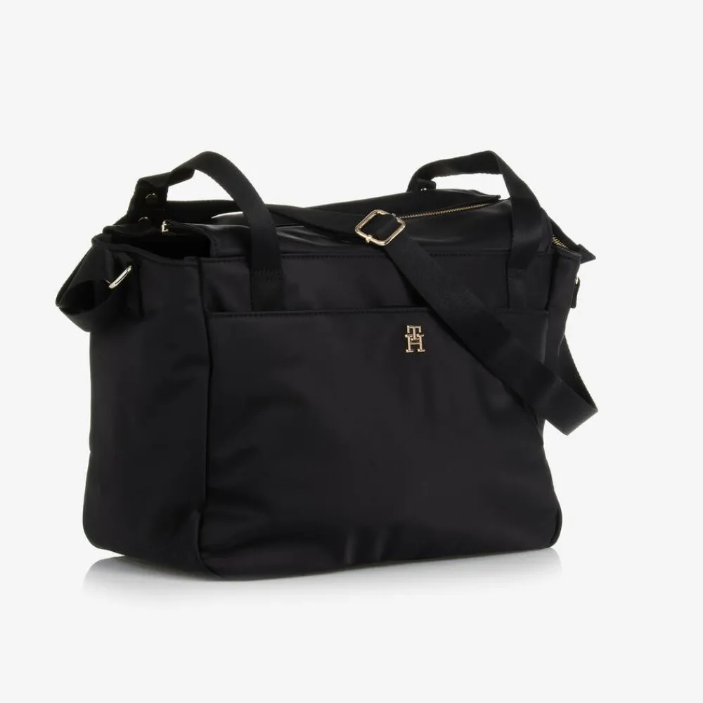 A stylish black changing bag by Tommy Hilfiger, in silky smooth recycled material with a gold-tone monogram on the front. The zip-fastening main compartment has internal pouches and a zipped pocket for easy organisation. There are two popper-fastening stroller straps over the top, with an adjustable fixed shoulder strap. The bag also has external pockets for additional storage and comes with a useful changing mat and an insulated bottle bag which secures internally with an elasticated strap.