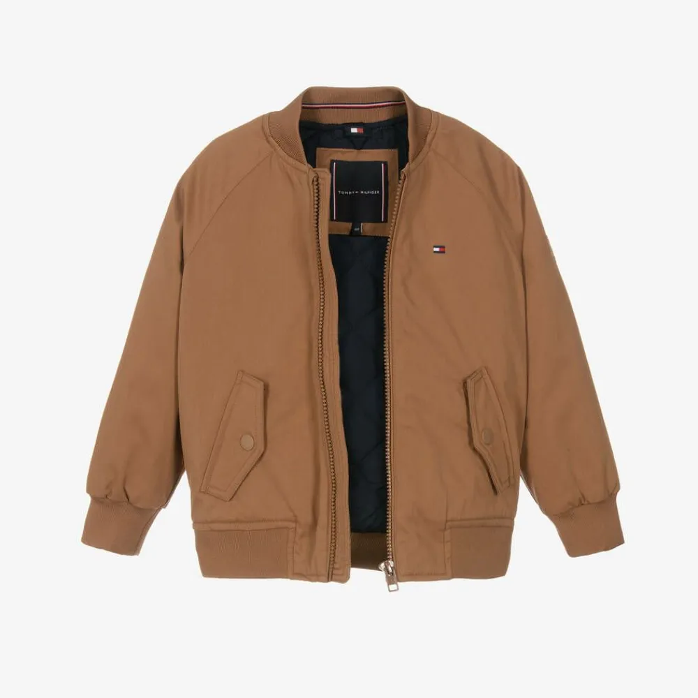 Light brown cotton-blend bomber jacket for boys by Tommy Hilfiger, made in soft twill. With warm, lightweight padding and a quilted, navy blue lining, it has useful pockets on the front and the brand's signature flag logo detailing.