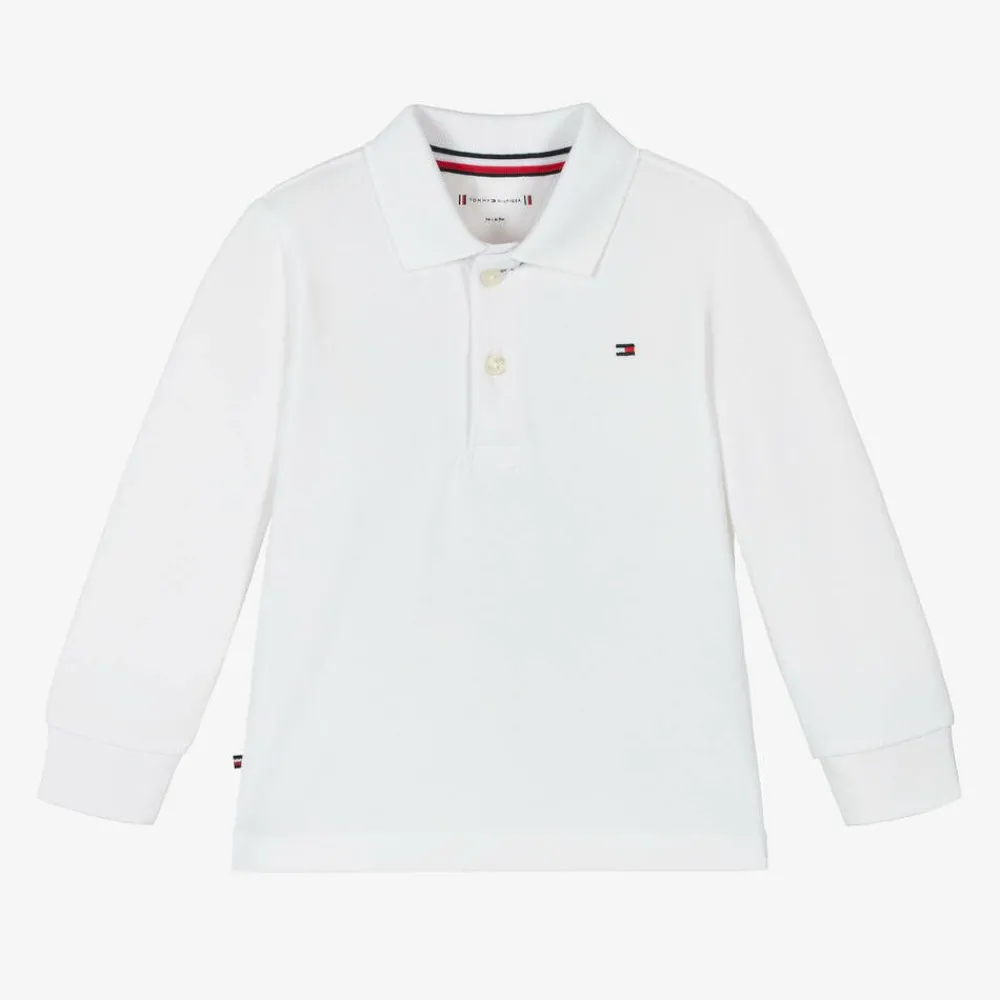 White cotton long-sleeved polo shirt for boys by American brand Tommy Hilfiger, made in soft, comfortable piqué. It has ribbed trims and branded button fastenings on the front placket, with the label's iconic flag logo embroidered on one side. The side seams are vented for comfort, with trims in the signature colours of red, white and blue.