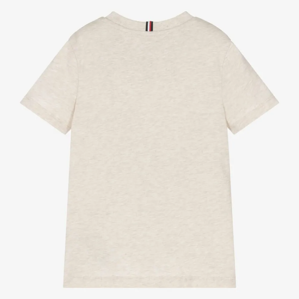 Beige marl T-shirt for boys and girls by Tommy Hilfiger, made in soft and comfortable cotton jersey. Ideal for casual wear, it has a classic crew neck and short sleeves. For instant brand recognition, there is a large navy blue logo printed across the chest, with the iconic flag logo embroidered on one sleeve and a striped tab on the back of the neckline in the designer's signature colours of red, white and blue. Smaller sizes have popper fastenings on one shoulder.