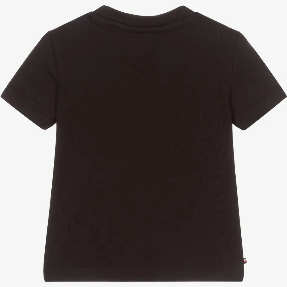 Baby boys and girls black T-shirt by Tommy Hilfiger, made in organic cotton jersey. It has the designer's logo print in red, white and navy blue on the front and a popper fastening on one shoulder.