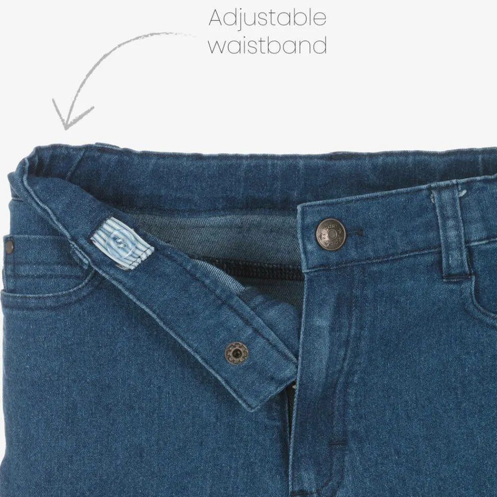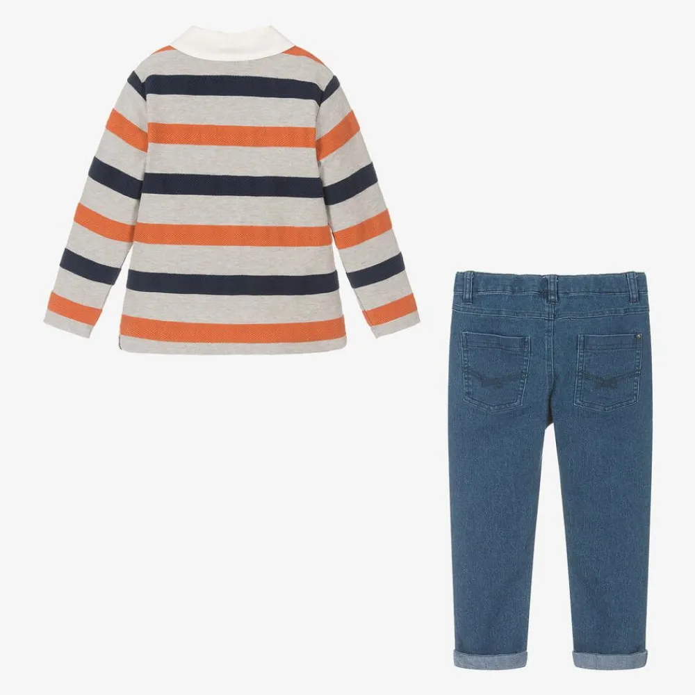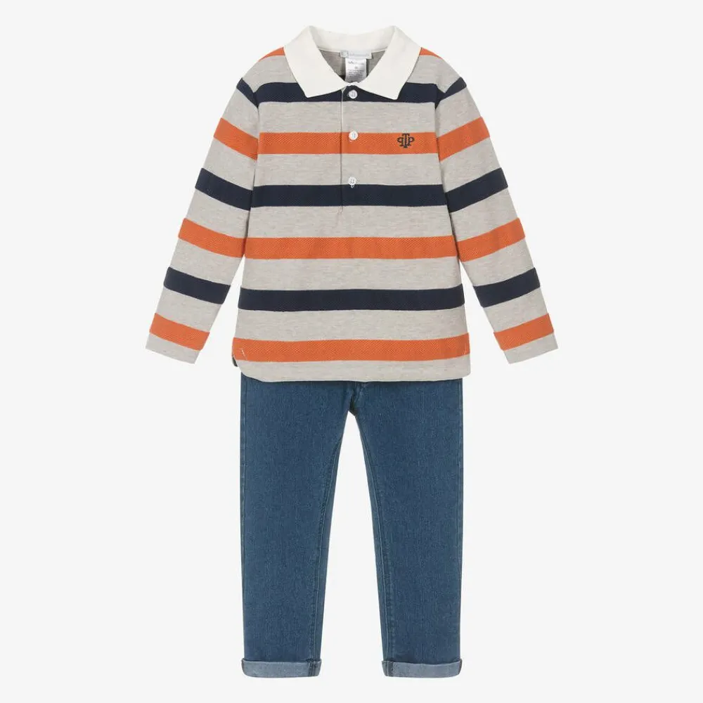 A casual outfit set for boys from Tutto Piccolo, comprising a grey striped rugby shirt and blue jeans. The long-sleeved top is made in soft cotton-blend jersey with woven, textured stripes in navy blue and orange. For a classic casual look, it has an ivory twill collar with button fastenings and an embroidered logo on the chest. It pairs with stretchy, lightweight jeans in a dark blue wash. Fastening with a zip and branded popper, they are styled with five pockets and fixed turn-ups. For comfort, the waistband is adjustable.