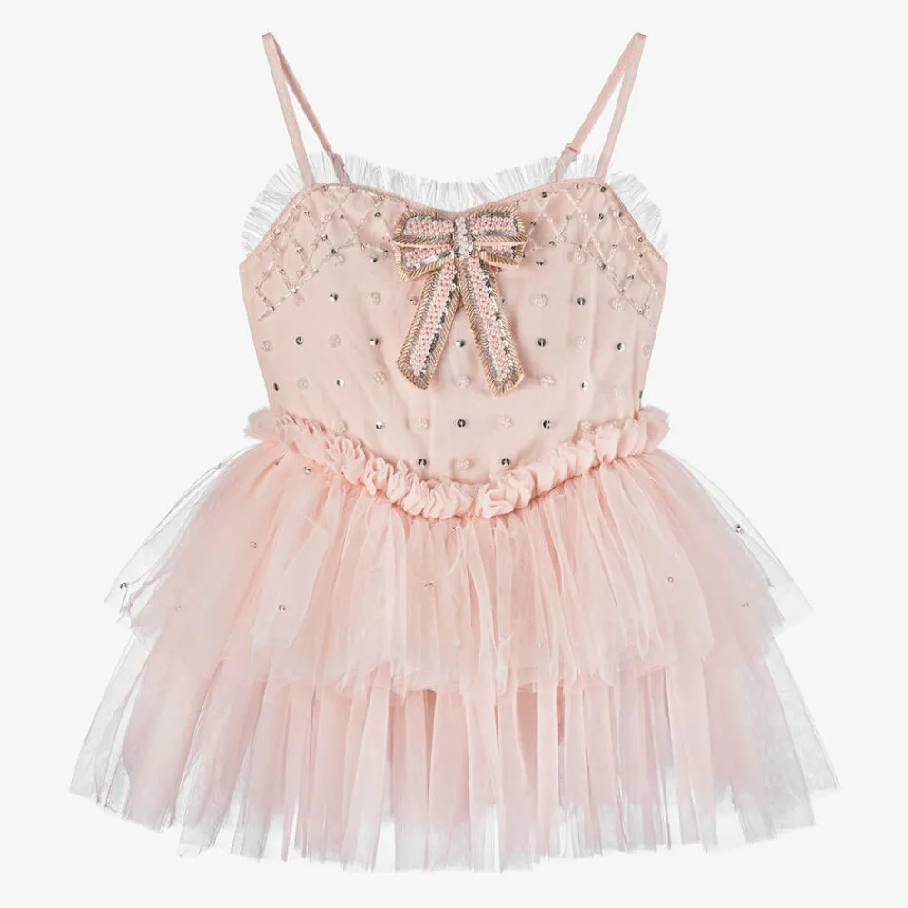 Gorgeous pale pink ballerina tutu dress for girls by Tutu du Monde, lovely for parties or special occasions. With adjustable shoulder straps and a comfortable shirred back, the woven bodice has a fine tulle overlay on the front. It is intricately hand-embellished with sparkling sequins and beads with a pearl bead bow shimmering beautifully in the centre. The tutu skirt is made in layers of gathered tulle for a voluminous effect, with attached jersey knickers for comfort and modesty. Items are made to last and become more lovely with wear as slight fading and fraying edges adds to their charm.